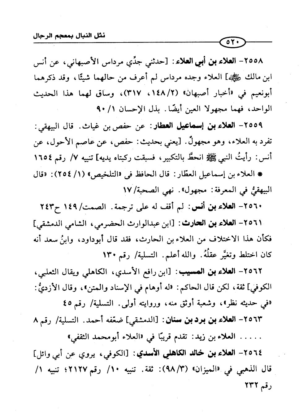 2558 - العلاء بن أبي العلاء: [حدثني جدِّي مرداس الأصبهاني، عن أنس ابن مالك -رَضِيَ الله عَنْهُ-] العلاء وجده مرداس لم أعرف من حالهما شيئًا، وقد ذكرهما أبو نعيم في "أخبار أصبهان" (2/ 148، 317)، وساق لهما هذا الحديث الواحد، فهما مجهولًا العين أيضًا. بذل الإحسان 1/ 90