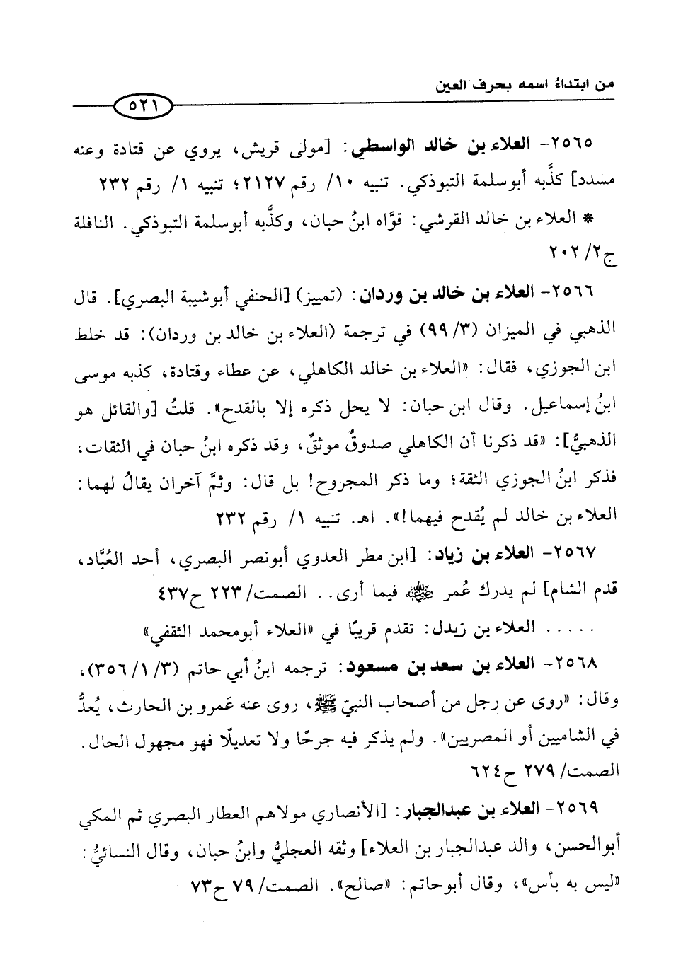 2569 - العلاء بن عبد الجبار: [الأنصاري مولاهم العطار البصري ثم المكي أبو الحسن، والد عبد الجبار بن العلاء] وثقه العجليُّ وابنُ حبان، وقال النسائيُّ: "ليس به بأس"، وقال أبو حاتم: "صالح". الصمت/ 79 ح 73
