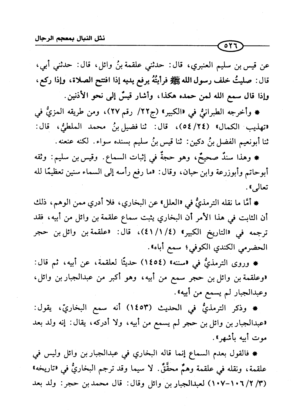 * فالقول بعدم السماع إنما قاله البخاري في عبد الجبار بن وائل وليس في علقمة، ونقله في علقمة وهمٌ محقَّقٌ. لا سيما وقد ترجم البخاريُّ في "تاريخه" (3/ 2/ 106 - 107) لعبد الجبار بن وائل وقال: قال مُحَمَّد بن حجر: ولد بعد