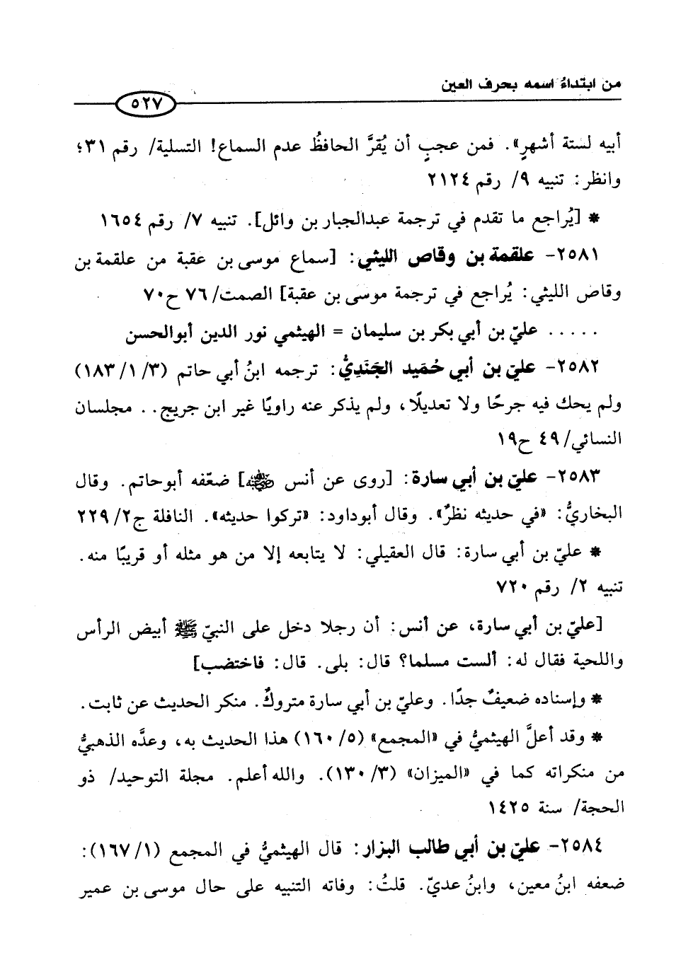2584 - عليّ بن أبي طالب البزار: قال الهيثميُّ في المجمع (1/ 167): ضعفه ابنُ معين، وابنُ عديّ. قلتُ: وفاته التنبيه على حال موسى بن عمير