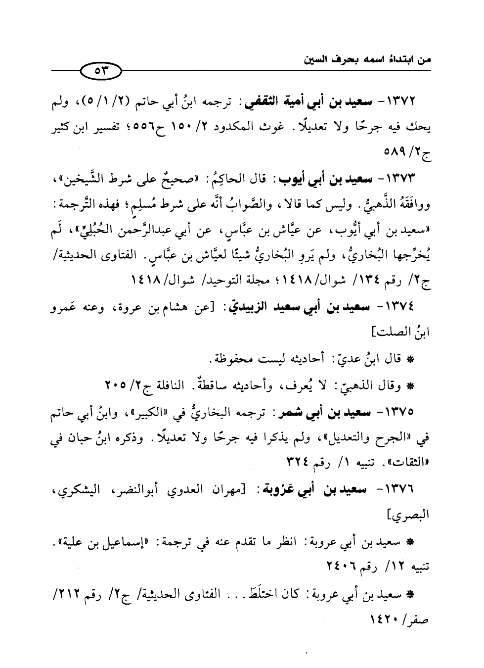 1372 - سعيد بن أبي أمية الثقفي: ترجمه ابنُ أبي حاتم (2/ 1/ 5)، ولم يحك فيه جرحًا ولا تعديلًا. غوث المكدود 2/ 150 ح556؛ تفسير ابن كثير ج2/ 589