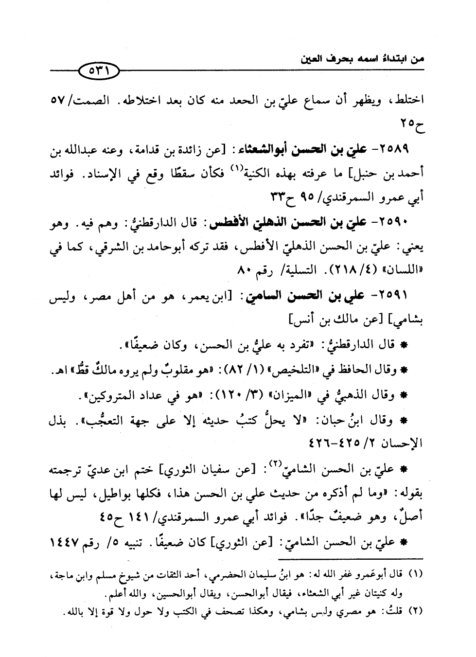 2590 - عليّ بن الحسن الذهليّ الأفطس: قال الدارقطنيُّ: وهم فيه. وهو يعني: عليّ بن الحسن الذهليّ الأفطس، فقد تركه أبو حامد بن الشرقي، كما في "اللسان" (4/ 218). التسلية/ رقم 80
