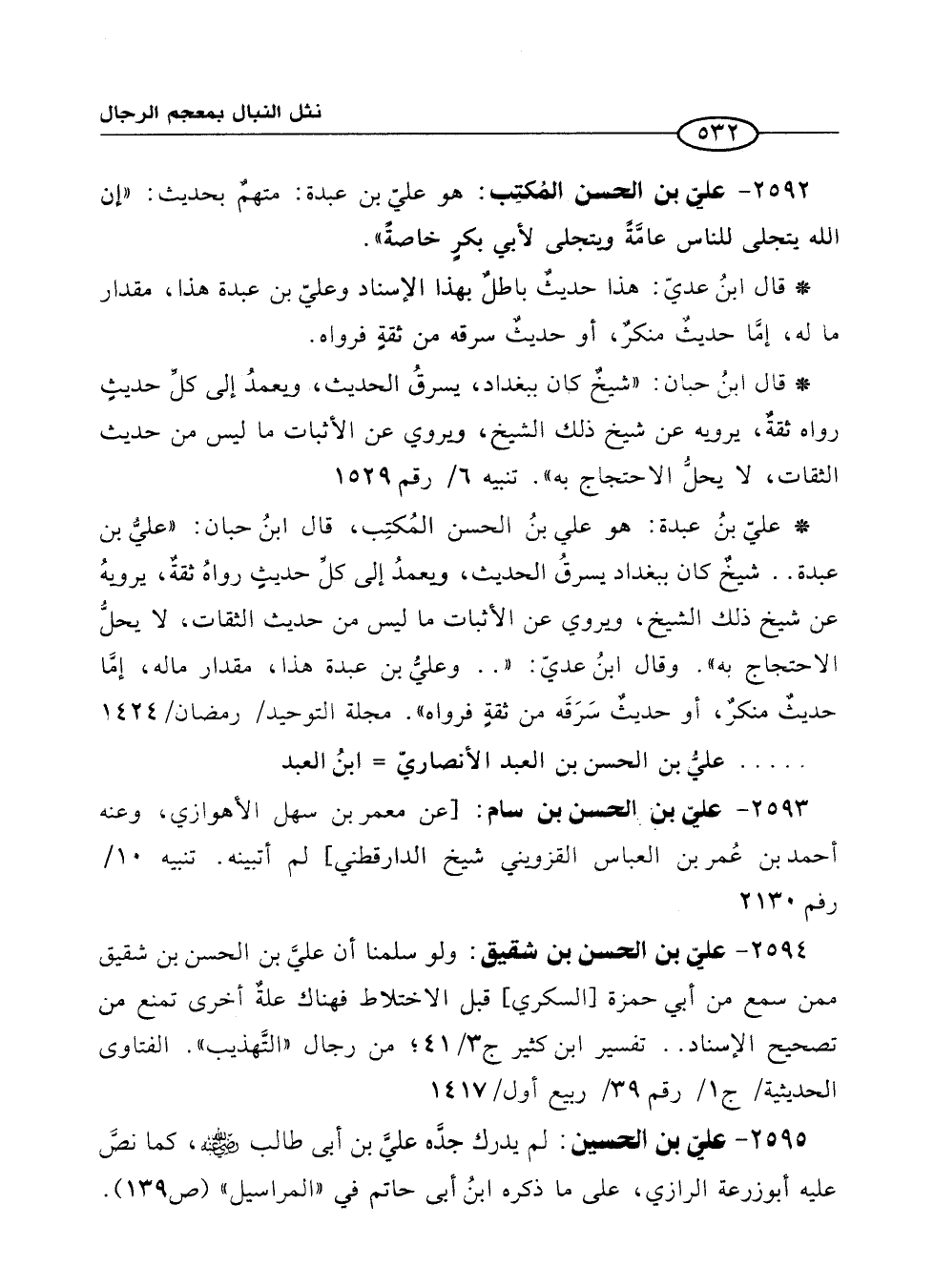 2594 - عليّ بن الحسن بن شقيق: ولو سلمنا أن عليَّ بن الحسن بن شقيق ممن سمع من أبي حمزة [السكري] قبل الاختلاط فهناك علةٌ أخرى تمنع من تصحيح الإسناد. . تفسير ابن كثير ج 3/ 41؛ من رجال "التَّهذيب". الفتاوى الحديثية/ ج 1/ رقم 39/ ربيع أول/ 1417