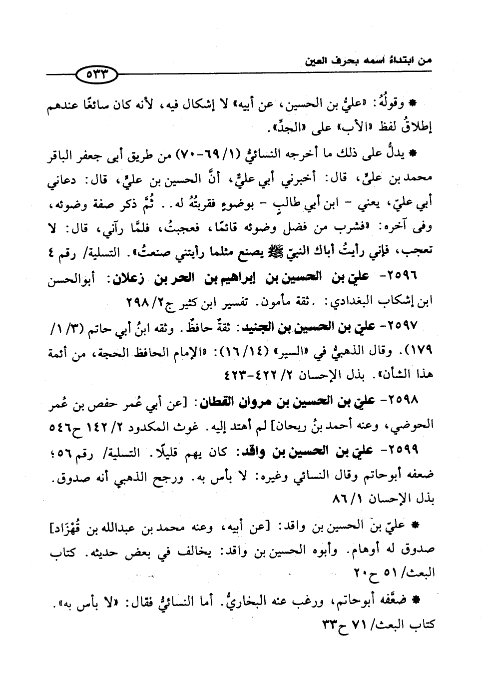 2599 - عليّ بن الحسين بن واقد: كان يهم قليلًا. التسلية/ رقم 56؛ ضعفه أبو حاتم وقال النسائي وغيره: لا بأس به. ورجح الذهبي أنه صدوق. بذل الإحسان 1/ 86