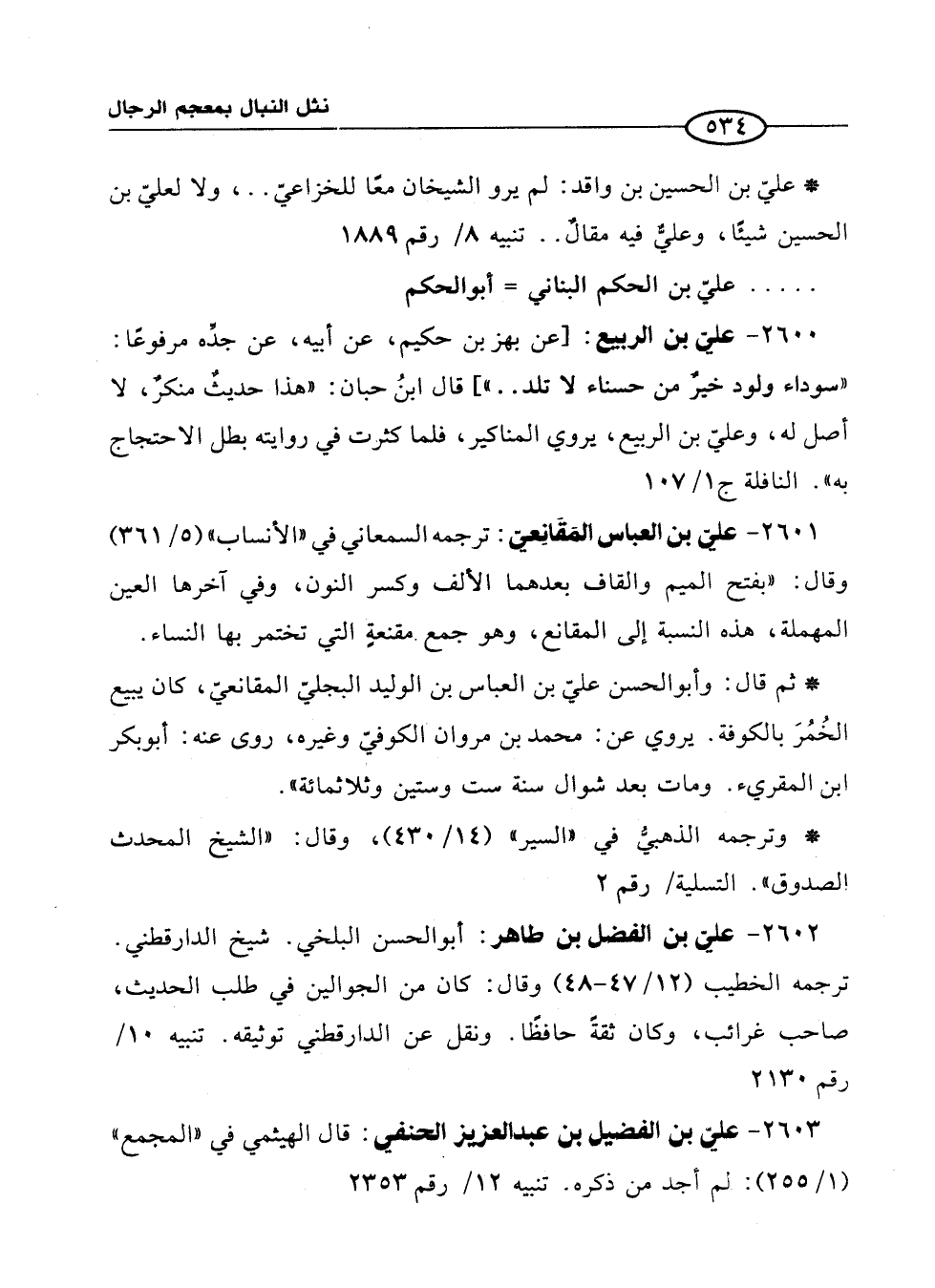 2601 - علي بن العباس المَقَانِعيّ: ترجمه السمعاني في "الأنساب" (5/ 361) وقال: "بفتح الميم والقاف بعدهما الألف وكسر النون، وفي آخرها العين المهملة، هذه النسبة إلى المقانع، وهو جمع. مقنعةٍ التي تختمر بها النساء.