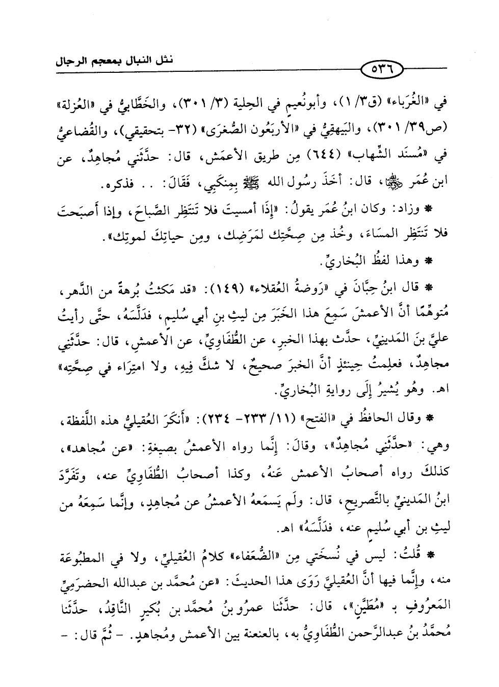 * قال ابنُ حِبَّانَ في "رَوضةُ العُقلاء" (149): "قد مَكثتُ بُرهةً من الدَّهر، مُتوهِّمًا أنَّ الأعمشَ سَمِعَ هذا الخَبَرَ مِن ليثِ بنِ أبي سُليمٍ، فدَلَّسَهُ، حتَّى رأيتُ عليَّ بنَ المَدينِيِّ، حدَّث بهذا الخبرِ، عن الطُّفَاوِيِّ، عن الأعمشِ، قال: حدَّثَنِي مجاهِدٌ، فعلِمتُ حِينئذٍ أنَّ الخبرَ صحيحٌ، لا شكَّ فِيهِ، ولا امتِرَاء في صِحَّتِه" اهـ. وهُو يُشيرُ إِلَى روايةِ البُخاريِّ.