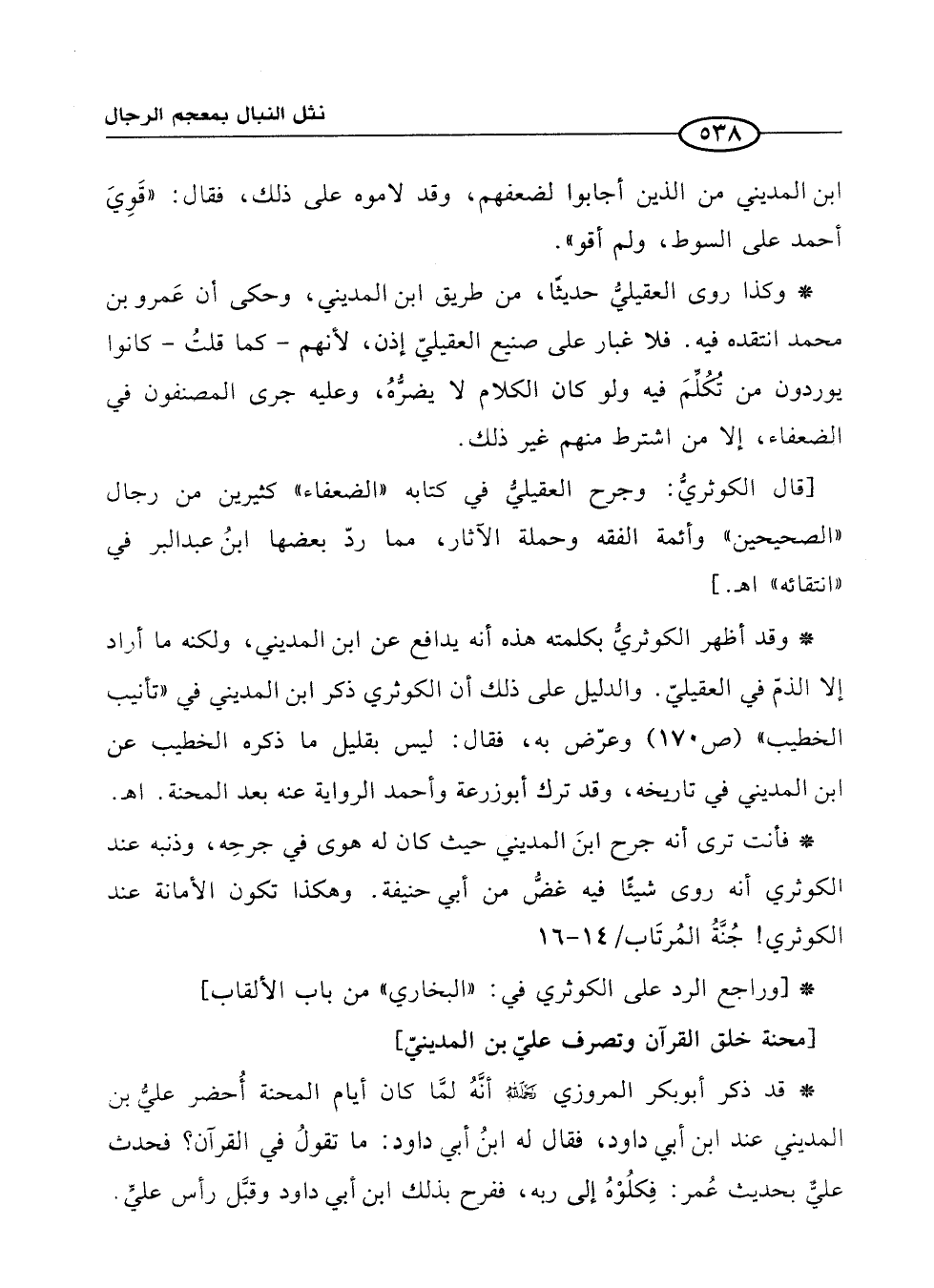 * وقد أظهر الكوثريُّ بكلمته هذه أنه يدافع عن ابن المديني، ولكنه ما أراد إلا الذمّ في العقيليّ. والدليل على ذلك أن الكوثري ذكر ابن المديني في "تأنيب الخطيب" (ص170) وعرّض به، فقال: ليس بقليل ما ذكره الخطيب عن ابن المديني في تاريخه، وقد ترك أبو زرعة وأحمد الرواية عنه بعد المحنة. اهـ.