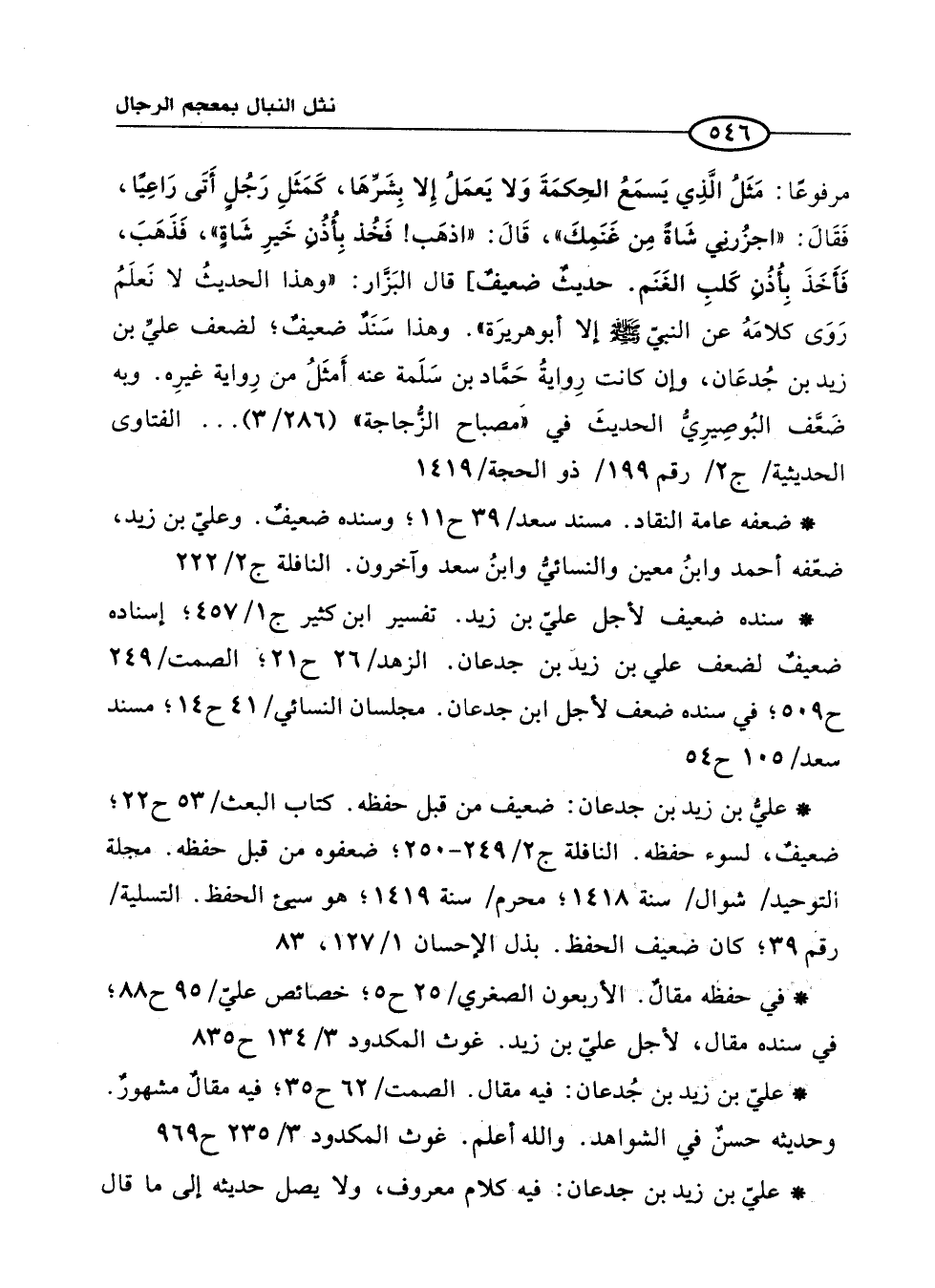 * في حفظه مقالٌ. الأربعون الصغري/25 ح 5؛ خصائص عليّ/ 95 ح 88؛ في سنده مقال، لأجل عليّ بن زيد. غوث المكدود 3/ 134 ح 835