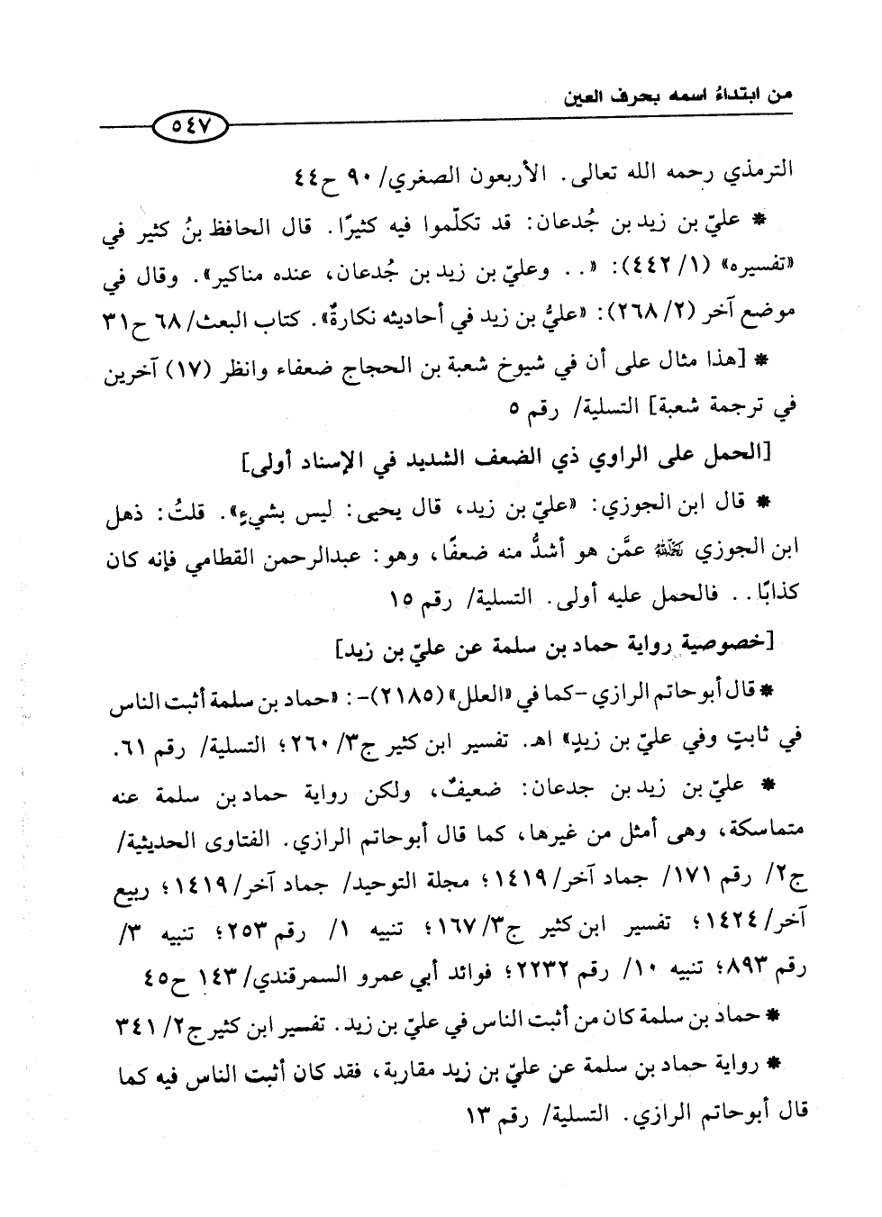 * عليّ بن زيد بن جدعان: ضعيفٌ، ولكن رواية حماد بن سلمة عنه متماسكة، وهي أمثل من غيرها، كما قال أبو حاتم الرازي. الفتاوى الحديثية / ج 2/ رقم 171/ جماد آخر / 1419؛ مجلة التوحيد /جماد آخر / 1419؛ ربيع آخر / 1424؛ تفسير ابن كثير ج 3/ 167؛ تنبيه 1/ رقم 253؛ تنبيه 3/ رقم 893؛ تنبيه 10/ رقم 2232؛ فوائد أبي عمرو السمرقندي / 143 ح 45
