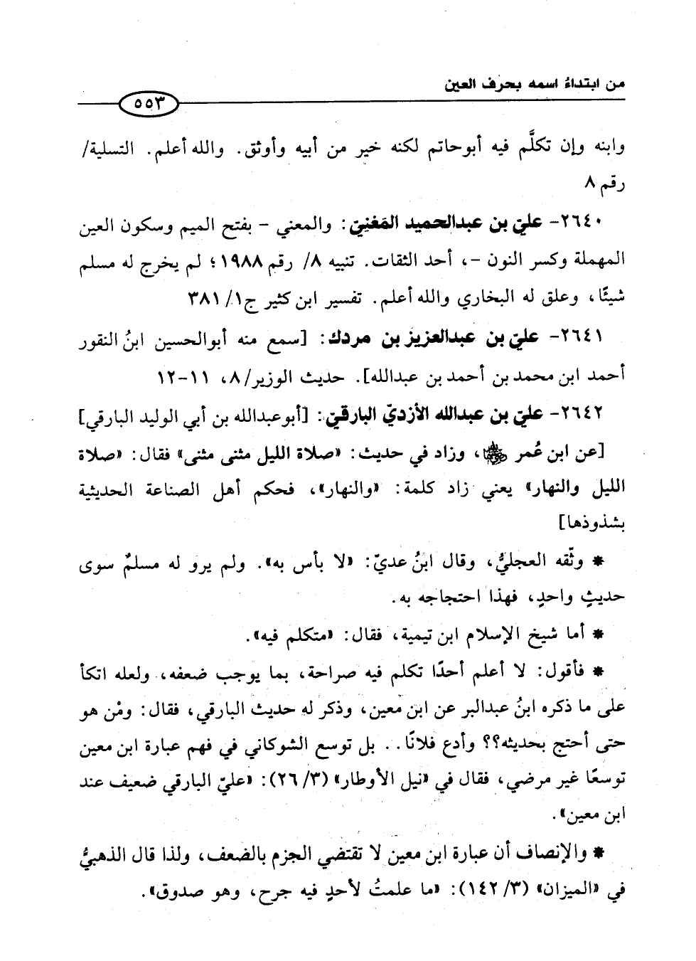 2640 - عليّ بن عبد الحميد المَعْنِيّ: والمعني -بفتح الميم وسكون العين المهملة وكسر النون -، أحد الثقات. تنييه 8/ رقم 1988؛ لم يخرج له مسلم شيئًا، وعلق له البخاري والله أعلم. تفسير ابن كثير ج1/ 381