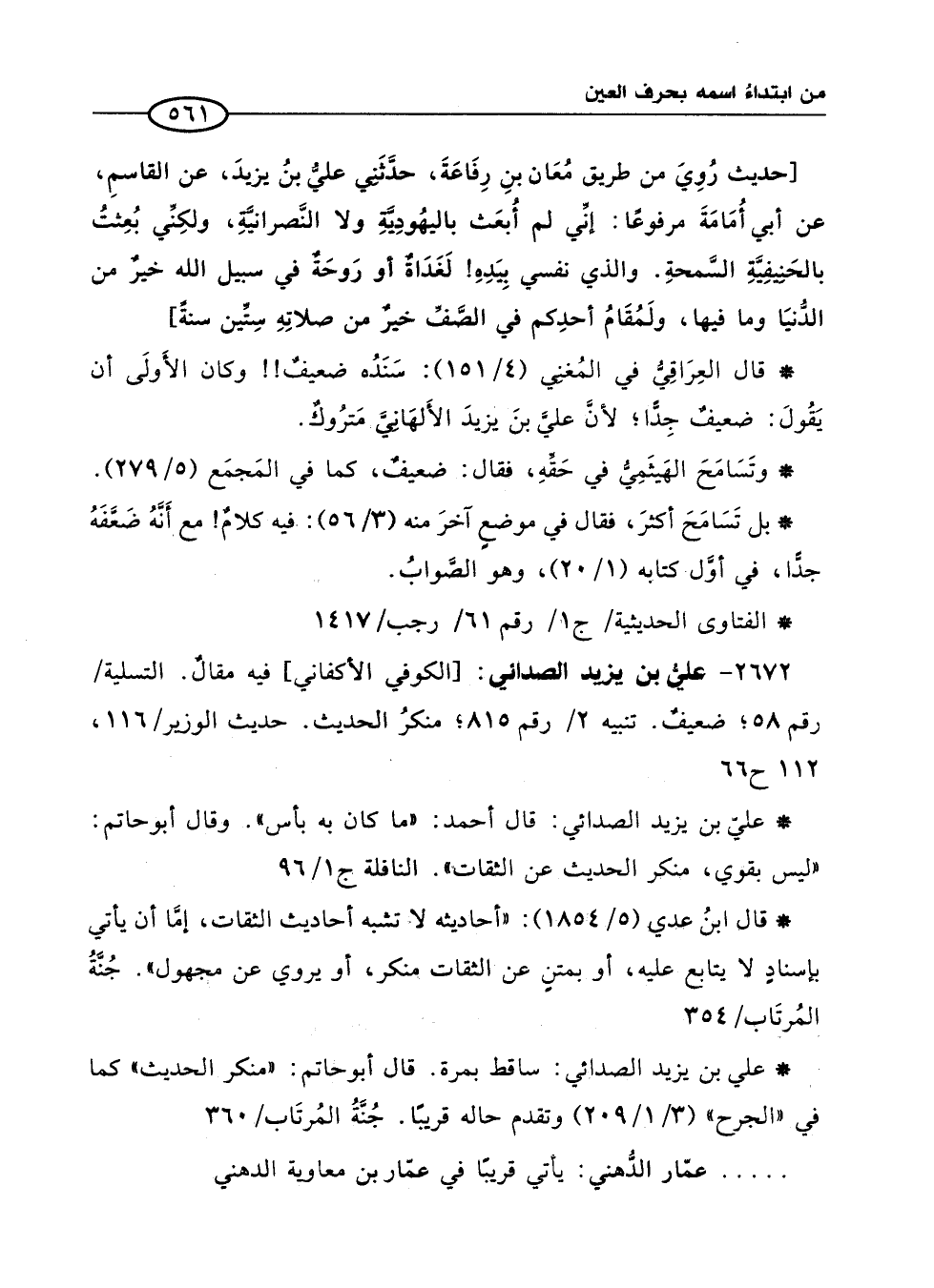 * عليّ بن يزيد الصدائي: قال أحمد: "ما كان به بأس". وقال أبو حاتم: "ليس بقوي، منكر الحديث عن الثقات". النافلة ج1/ 96