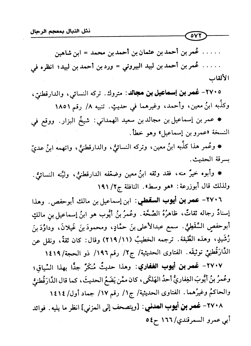 2706 - عمر بن أيوب السقطي: ابن إسماعيل بن مالك أبو حفص. وهذا إسنادٌ رجاله ثقاتٌ، ظاهرُهُ الصِّحَّة. وعُمرُ بنُ أيُّوب هو ابنُ إسماعيل بنِ مالكٍ أبو حفصٍ السَّقَطيُّ. سمع عبد الأعلي بنَ حمَّادٍ، ومحمودَ بنَ غَيلانَ، وداوُدَ بنَ رُشَيدٍ، وهذه الطَّبقة. ترجمه الخطيبُ (11/ 219) وقال: كان ثقةً، ونقل عن الدَّارَقُطنيِّ توثيقَه. الفتاوى الحديثية /ج 2/ رقم 196/ ذو الحجة / 1419