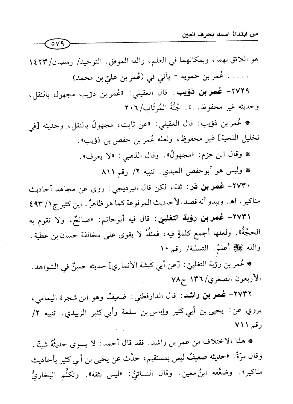 2731 - عُمر بن رؤبة التغلبيّ: قال فيه أبو حاتم: "صالحٌ، ولا تقوم به الحجَّةُ". ولعلها أجمع كلمةٍ فيه، فمثلُهُ لا يقوى على مخالفة حسان بن عطية. والله سبحانه وتعالى أعلمُ. التسلية / رقم 10