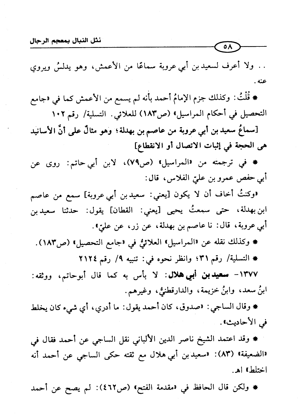 * في ترجمته من "المراسيل" (ص 79)، لابن أبي حاتم: روى عن أبي حفص عمرو بن عليّ الفلاس، قال: "وكنتُ أخاف أن لا يكون [يعني: سعيد بن أبي عروبة] سمع من عاصم ابن بهدلة، حتى سمعتُ يحيى [يعني: القطان] يقول: حدثنا سعيد بن أبي عروبة، قال: نا عاصم بن بهدلة، عن زر، عن عليّ".