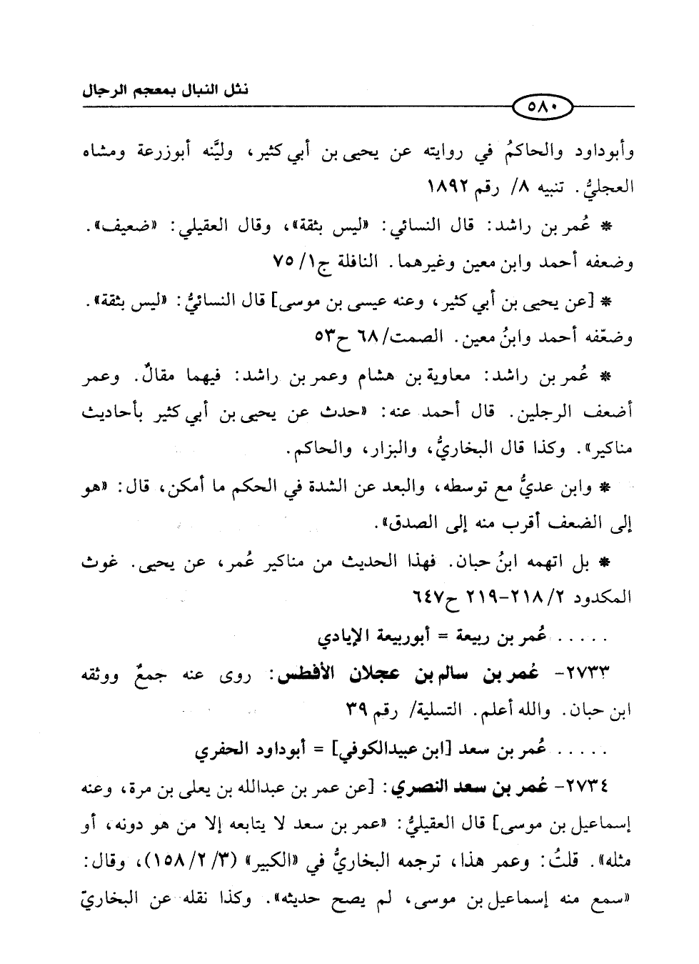* عُمر بن راشد: معاوية بن هشام وعمر بن راشد: فيهما مقالٌ. وعمر أضعف الرجلين. قال أحمد عنه: "حدث عن يحيى بن أبي كثير بأحاديث مناكير". وكذا قال البخاريُّ، والبزار، والحاكم.