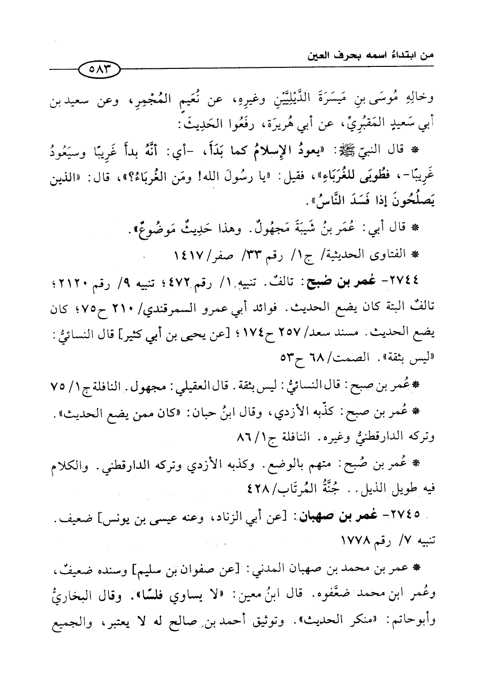 2745 - عمر بن صهبان: [عن أبي الزناد، وعنه عيسى بن يونس] ضعيف. تنبيه 7/ رقم 1778