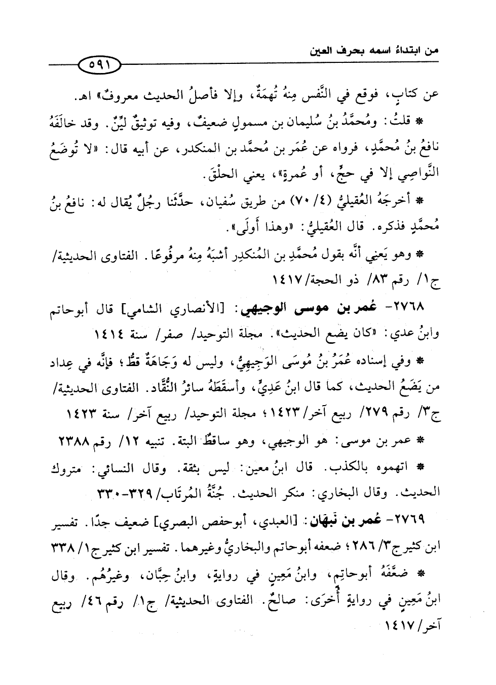 2768 - عُمر بن موسى الوجيهي: [الأنصاري الشامي] قال أبو حاتم وابنُ عدي: "كان يضع الحديث". مجلة التوحيد / صفر/ سنة 1414