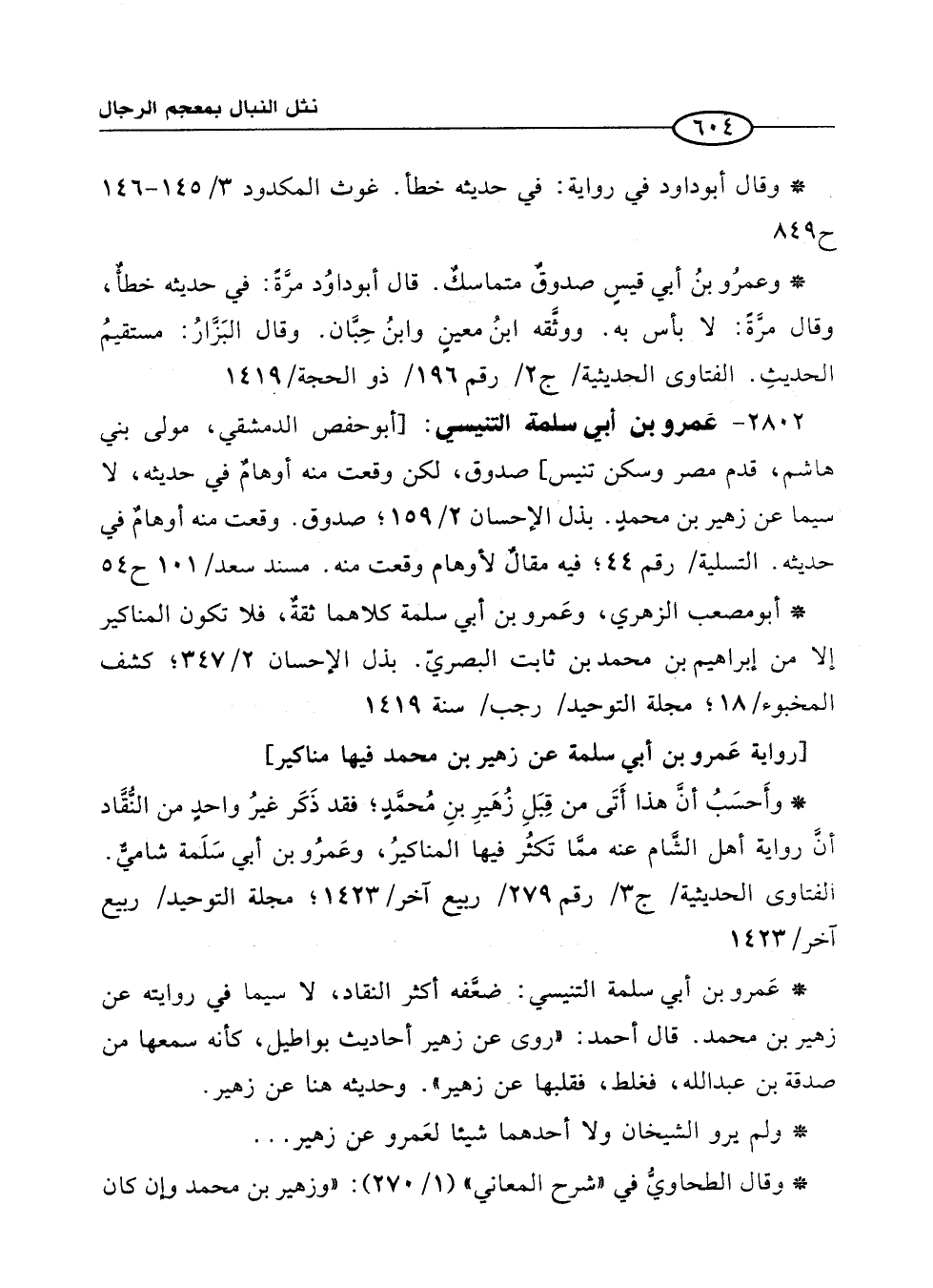 2802 - عمرو بن أبي سلمة التنيسي: [أبو حفص الدمشقي، مولى بني هاشم، قدم مصر وسكن تنيس] صدوق، لكن وقعت منه أوهامٌ في حديثه، لا سيما عن زهير بن محمدٍ. بذل الإحسان 2/ 159؛ صدوق. وقعت منه أوهامٌ في حديثه. التسلية/ رقم 44؛ فيه مقالٌ لأوهام وقعت منه. مسند سعد / 101 ح 54