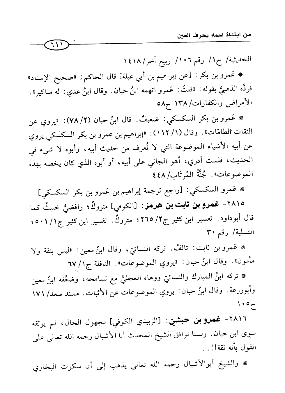 * عَمرو بن بكر: [عن إبراهيم بن أبي عبلة] قال الحاكم: "صحيح الإسناد" فردَّه الذهبيّ بقوله: "قلتُ: عَمرو اتهمه ابنُ حبان. وقال ابنُ عديّ: له مناكير". الأمراض والكفارات / 138 ح 58