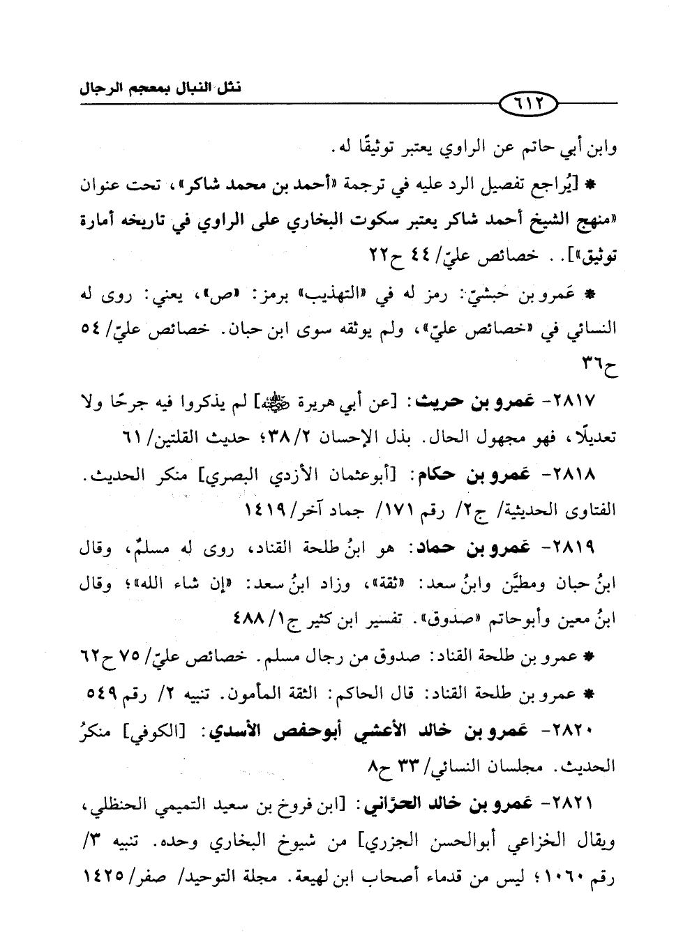 2821 - عَمرو بن خالد الحرَّاني: [ابن فروخ بن سعيد التميمي الحنظلي، ويقال الخزاعي أبو الحسن الجزري] من شيوخ البخاري وحده. تنبيه 3/ رقم 1060؛ ليس من قدماء أصحاب ابن لهيعة، مجلة التوحيد / صفر/1425