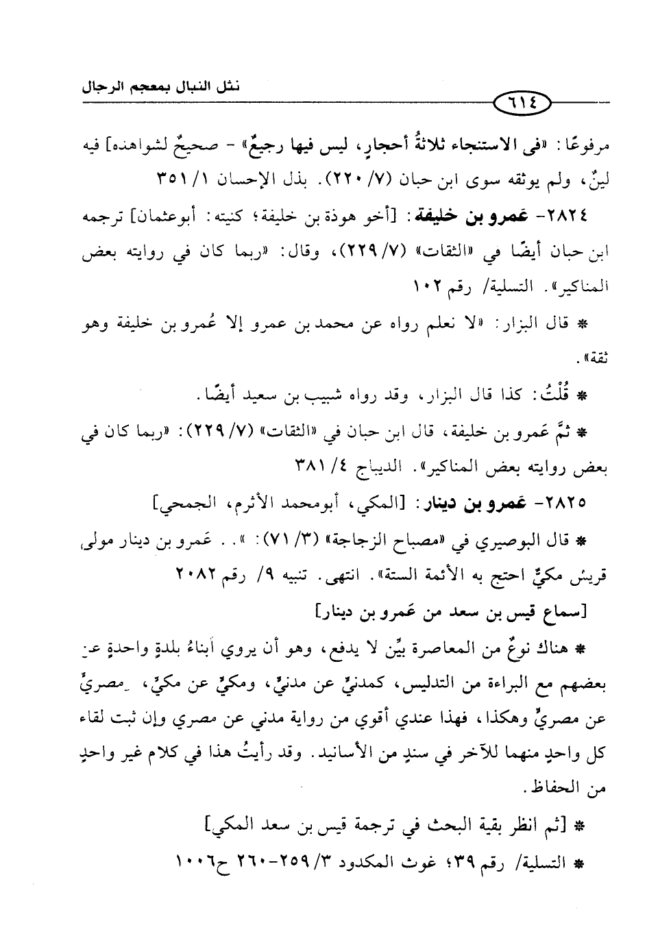 2824 - عَمرو بن خليفة: [أخو هوذة بن خليفة، كنيته: أبو عثمان] ترجمه ابن حبان أيضًا في "الثقات" (7/ 229)، وقال: "ربما كان في روايته بعض المناكير". التسلية/ رقم 102