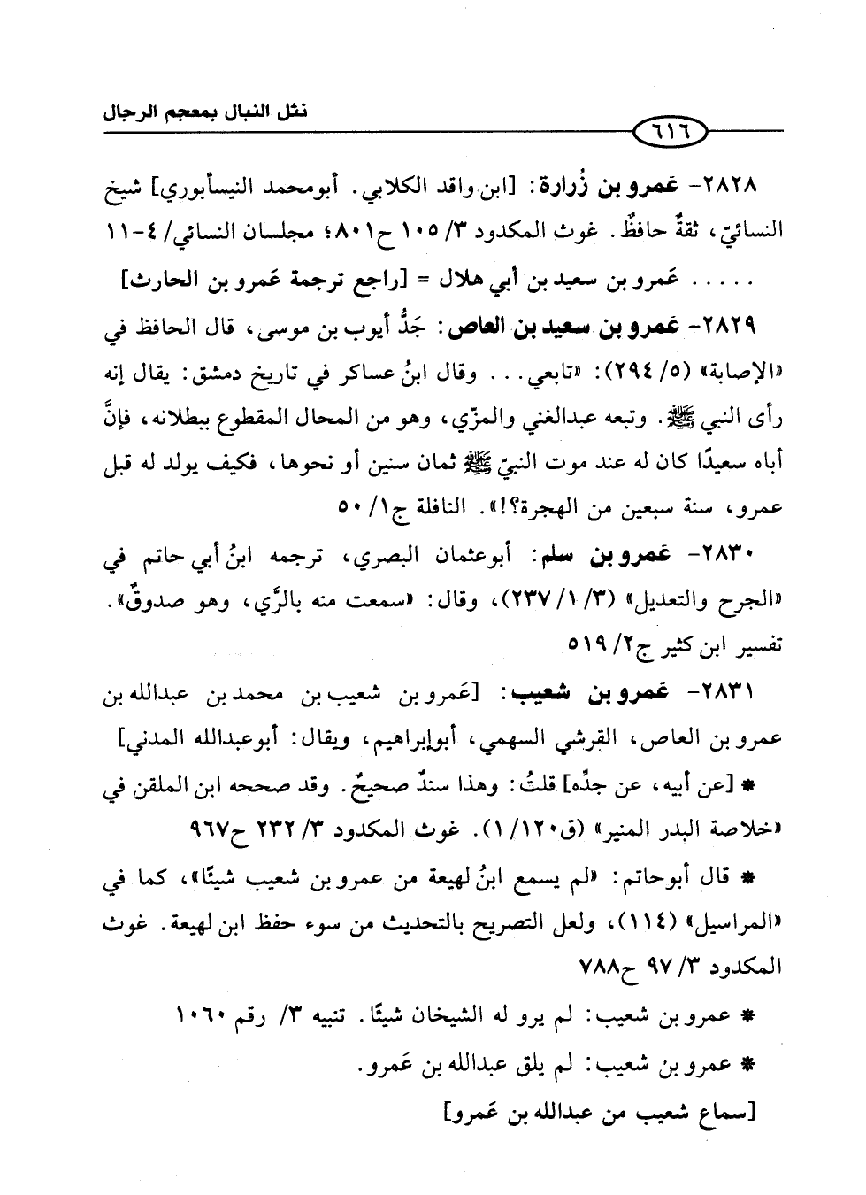 2829 - عَمرو بن سعيد بن العاص: جَدُّ أيوب بن موسى، قال الحافظ في "الإصابة" (5/ 294): "تابعي. . . وقال ابنُ عساكر في تاريخ دمشق: يقال إنه رأى النبي -صَلَّى الله عَلَيْهِ وَسَلَّمَ-. وتبعه عبد الغني والمزّي، وهو من المحال المقطوع ببطلانه، فإنَّ أباه سعيدًا كان له عند موت النبي -صَلَّى الله عَلَيْهِ وَسَلَّمَ- ثمان سنين أو نحوها، فكيف يولد له قبل عَمرو، سنة سبعين من الهجرة؟! ". النافلة ج 1/ 50