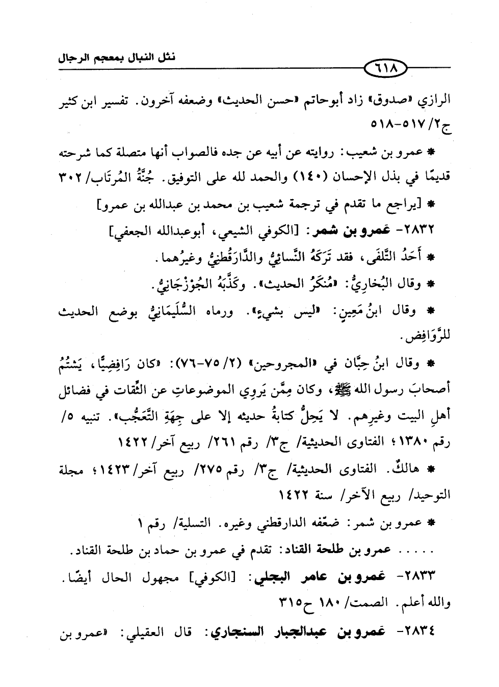 2834 - عَمرو بن عبد الجبار السنجاري: قال العقيلي: "عمرو بن