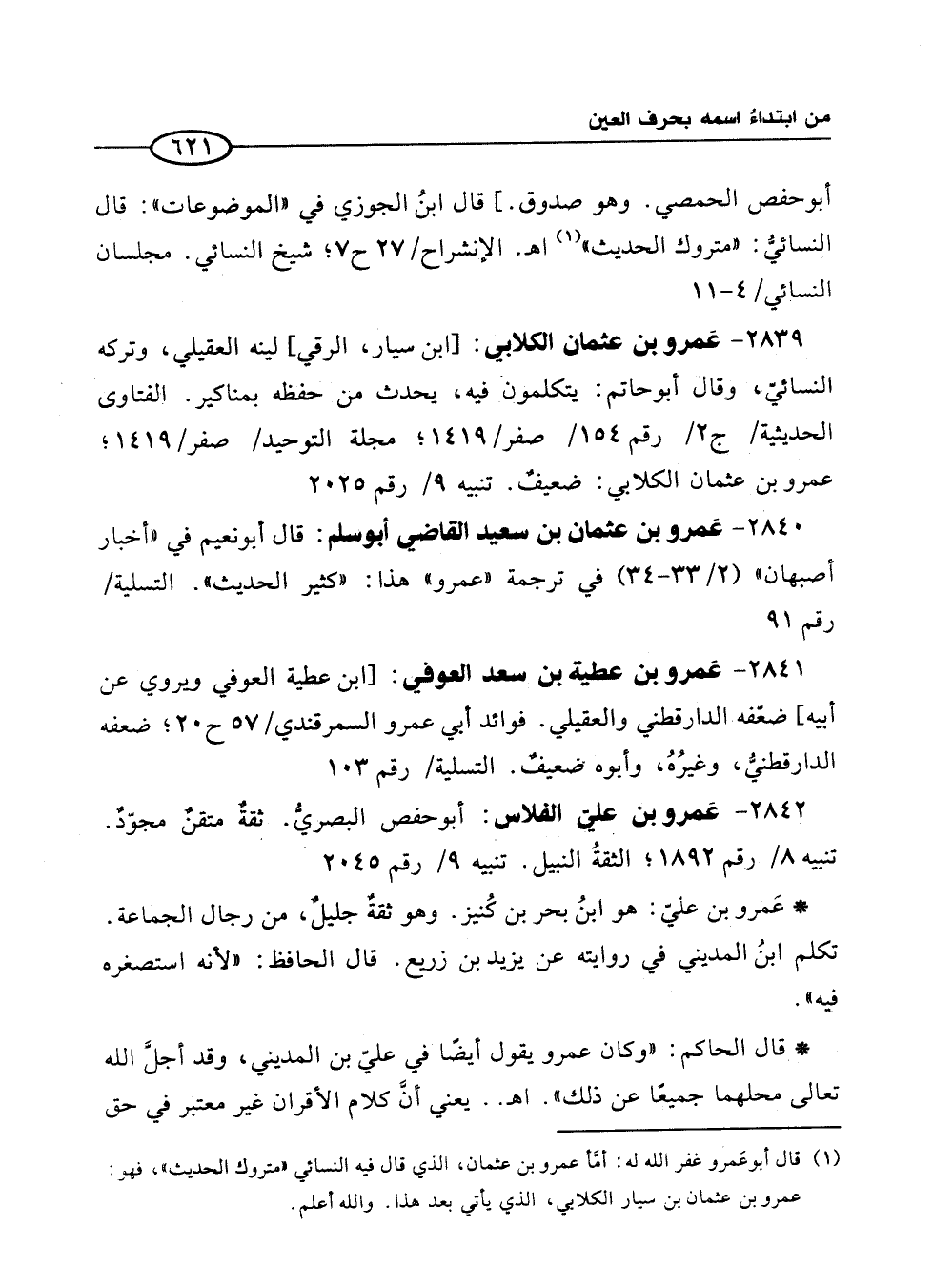 2840 - عَمرو بن عثمان بن سعيد القاضي أبو سلم: قال أبو نعيم في "أخبار أصبهان" (2/ 33 - 34) في ترجمة "عمرو" هذا: "كثير الحديث". التسلية/ رقم 91