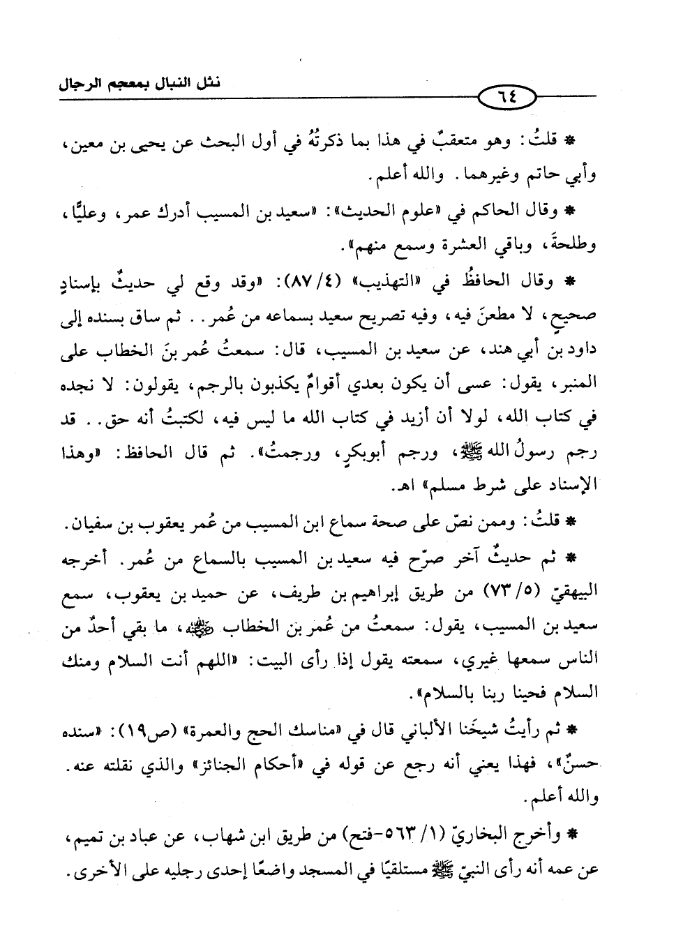 * ثم حديث آخر صرّح فيه سعيد بن المسيب بالسماع من عُمر. أخرجه البيهقيّ (5/ 73) من طريق إبراهيم بن طريف، عن حميد بن يعقوب، سمع سعيد بن المسيب، يقول: سمعتُ من عُمر بن الخطاب -رَضِيَ الله عَنْهُ-، ما بقي أحدٌ من الناس سمعها غيري، سمعته يقول إذا رأى البيت: "اللهم أنت السلام ومنك السلام فحينا ربنا بالسلام".