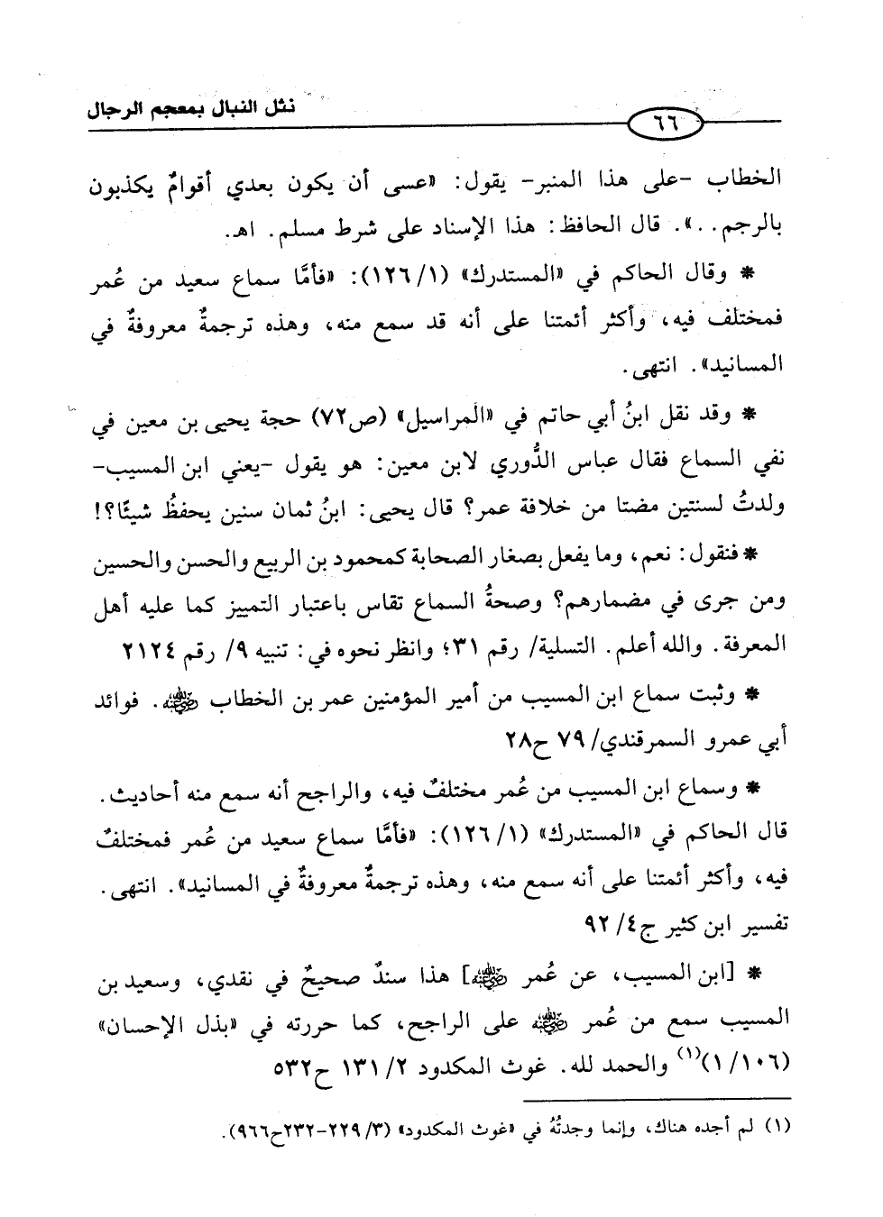 * [ابن المسيب، عن عُمر -رَضِيَ الله عَنْهُ-] هذا سندٌ صحيحٌ في نقدي، وسعيد بن المسيب سمع من عُمر -رَضِيَ الله عَنْهُ- على الراجح، كما حررته في "بذل الإحسان" (106/ 1) (1) والحمد لله. غوث المكدود 2/ 131 ح 532