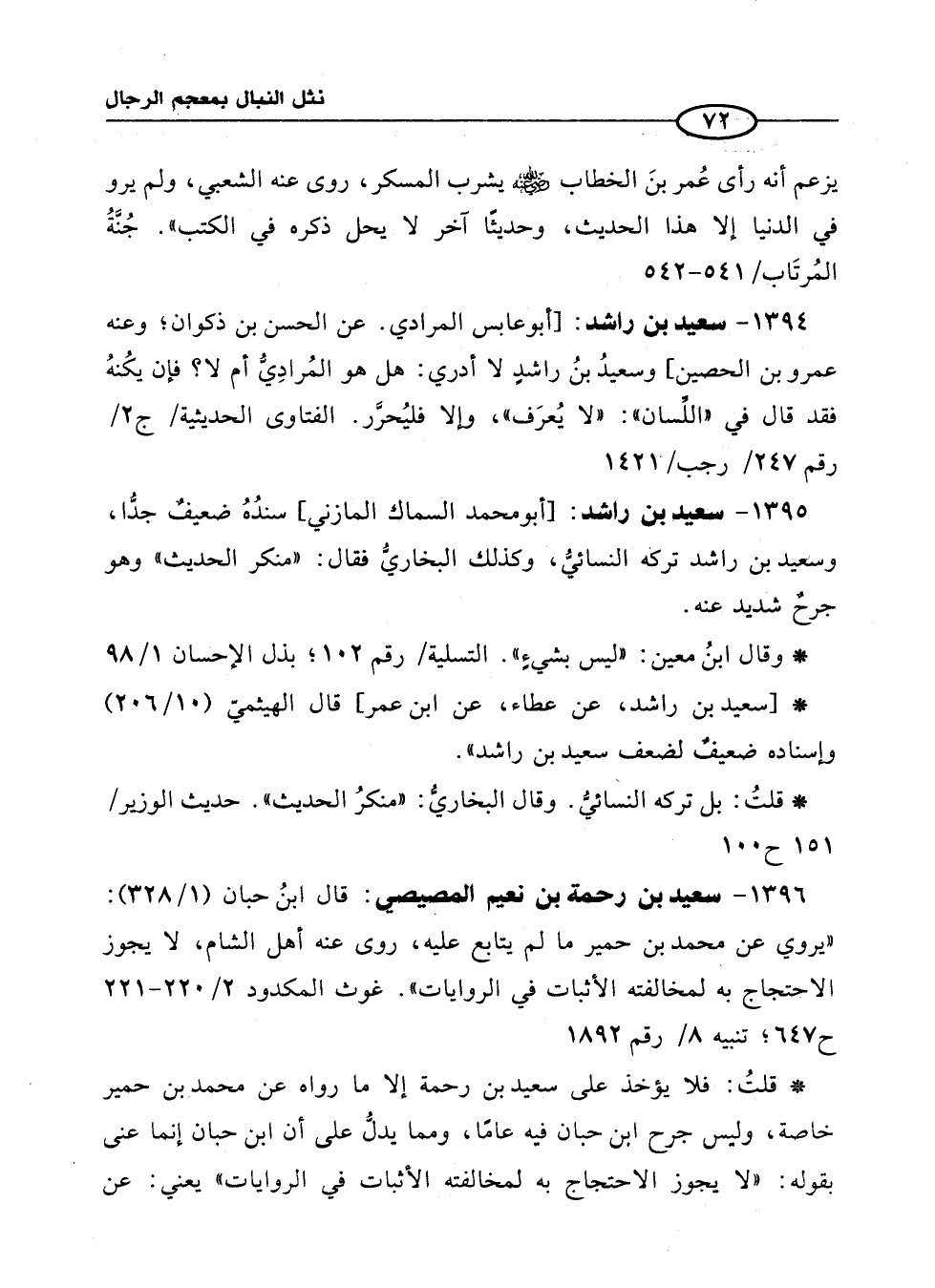 1396 - سعيد بن رحمة بن نعيم المصيصي: قال ابنُ حبان (1/ 328): " يروي عن محمد بن حمير ما لم يتابع عليه، روى عنه أهل الشام، لا يجوز الاحتجاج به لمخالفته الأثبات في الروايات". غوث المكدود 2/ 220 - 221 ح 647؛ تنبيه 8/ رقم 1892