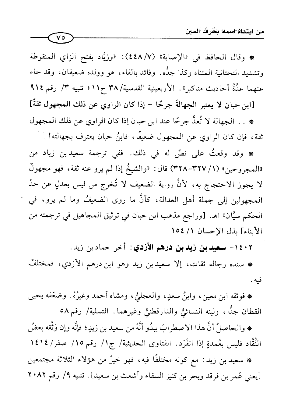 * والحاصلُ أنَّ هذا الاضطرابَ يبدُو أنَّهُ من سعيد بن زيدٍ؛ فإنَّه وإن وَثَّقه بعضُ النُّقَّاد فليس بعُمدةٍ إذا انفَرَد. الفتاوى الحديثية/ ج 1/ رقم 15/ صفر/ 1414