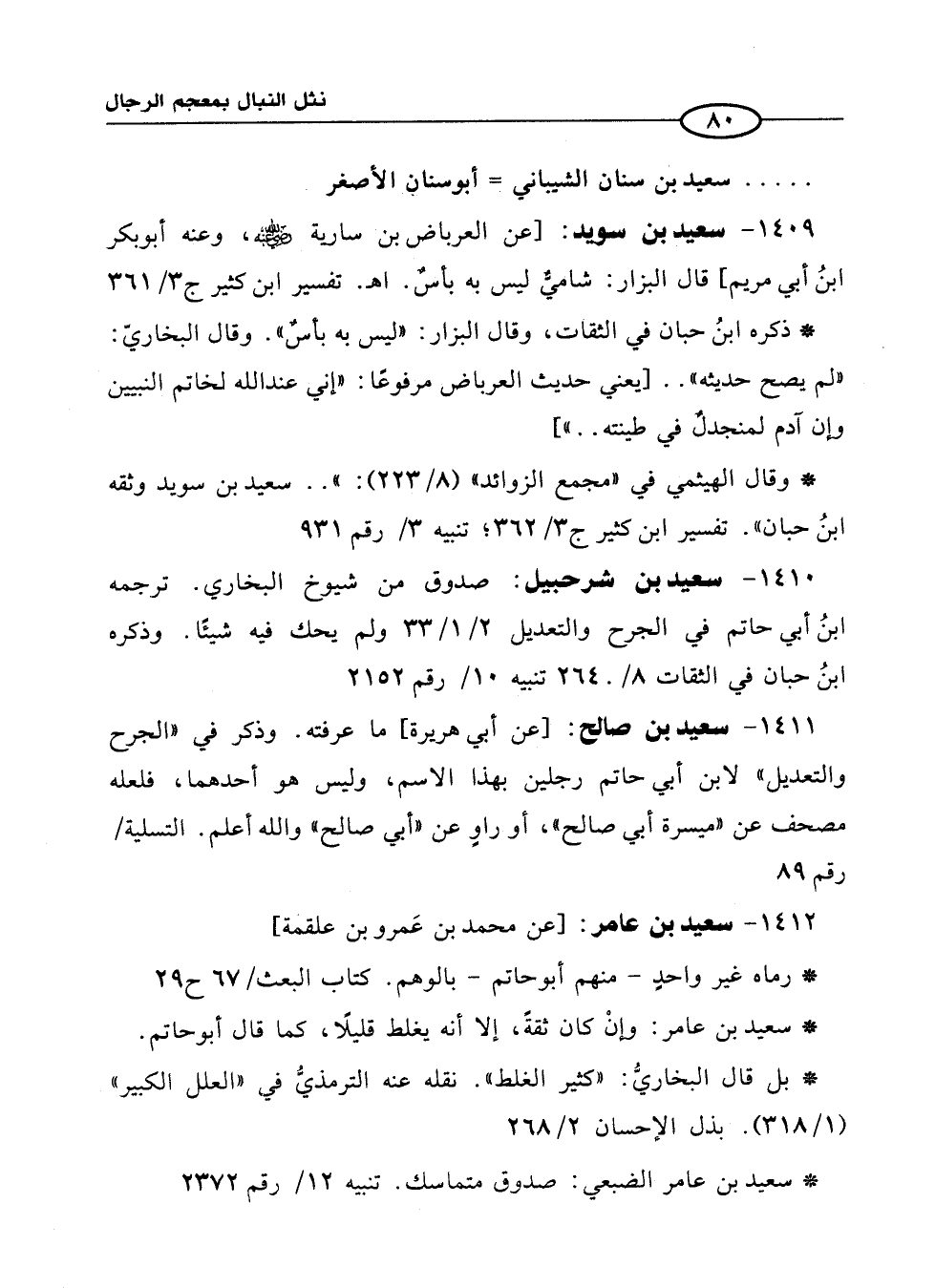 1409 - سعيد بن سويد: [عن العرباض بن سارية -رَضِيَ الله عَنْهُ-، وعنه أبو بكر ابنُ أبي مريم] قال البزار: شاميٌّ ليس به بأسٌ. اهـ. تفسير ابن كثير ج 3/ 361