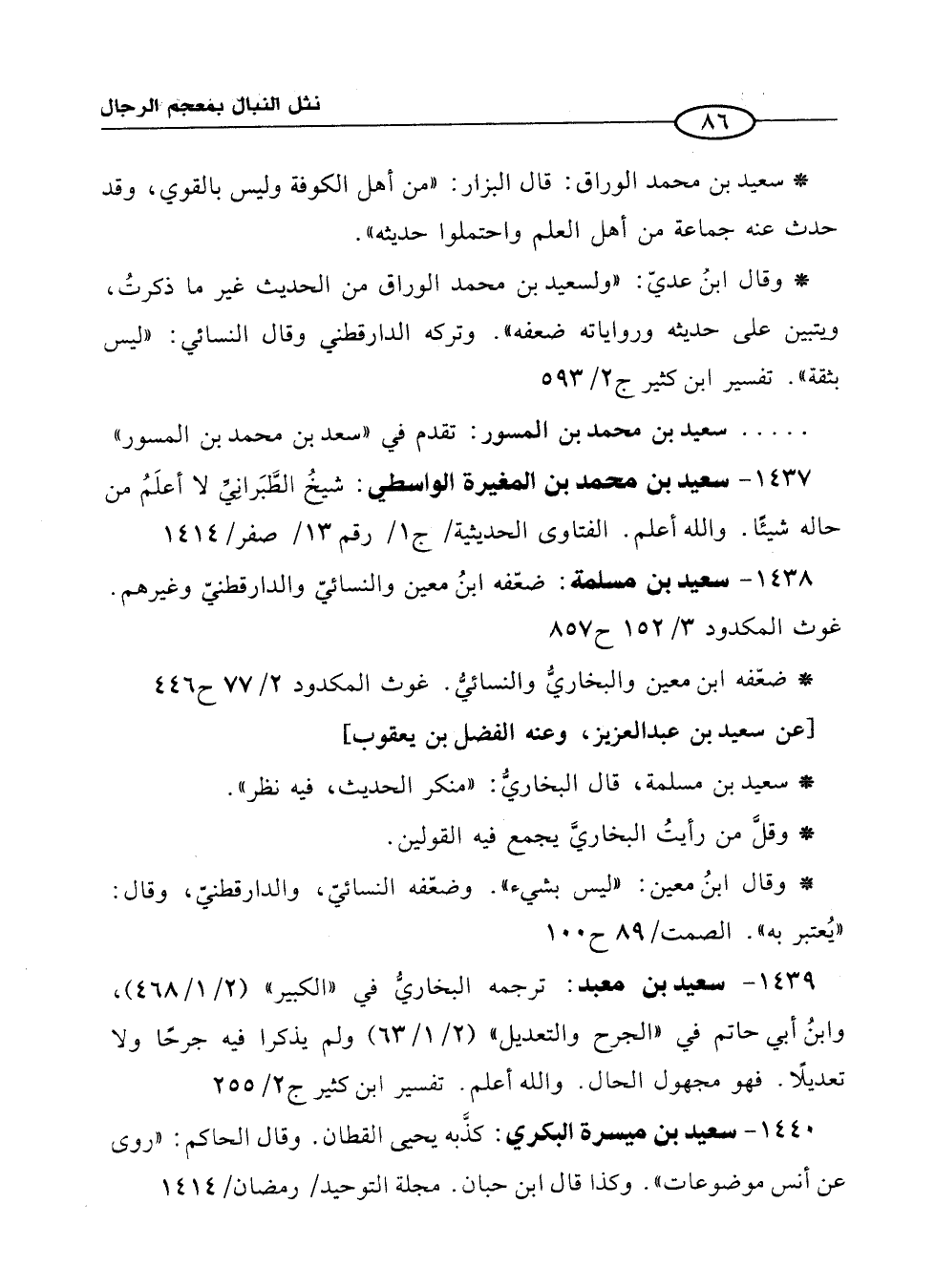 * وقال ابن عديّ: "ولسعيد بن محمد الوراق من الحديث غير ما ذكرتُ، ويتبين على حديثه ورواياته ضعفه". وتركه الدارقطني وقال النسائي: "ليس بثقة". تفسير ابن كثير ج 2/ 593