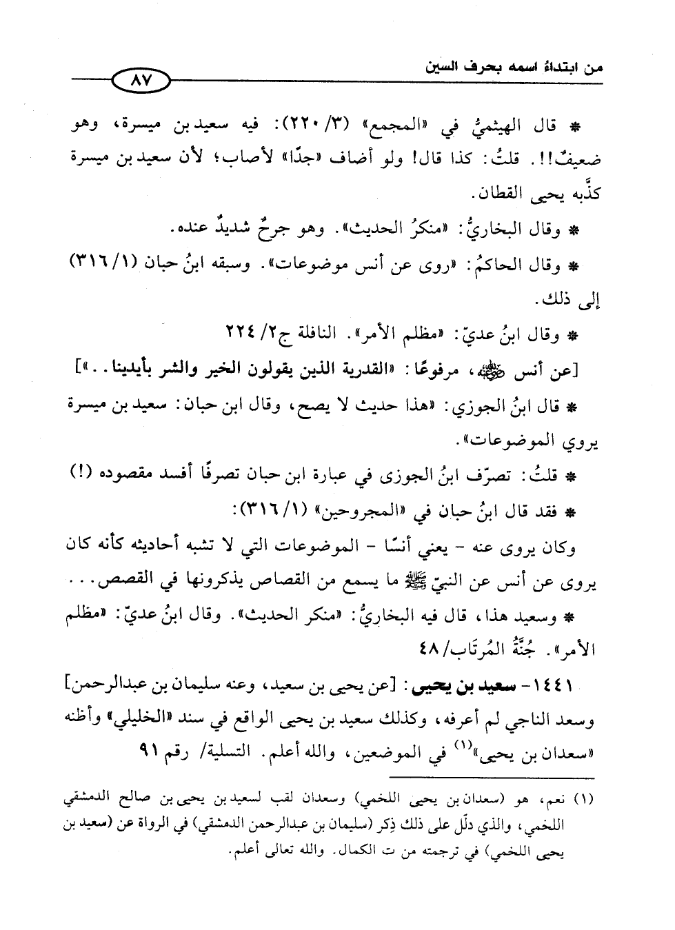 1441 - سعيد بن يحيى: [عن يحيى بن سعيد، وعنه سليمان بن عبد الرحمن] وسعد الناجي لم أعرفه، وكذلك سعيد بن يحيى الواقع في سند "الخليلي" وأظنه "سعدان بن يحيى" (1) في الموضعين، والله أعلم. التسلية/ رقم 91