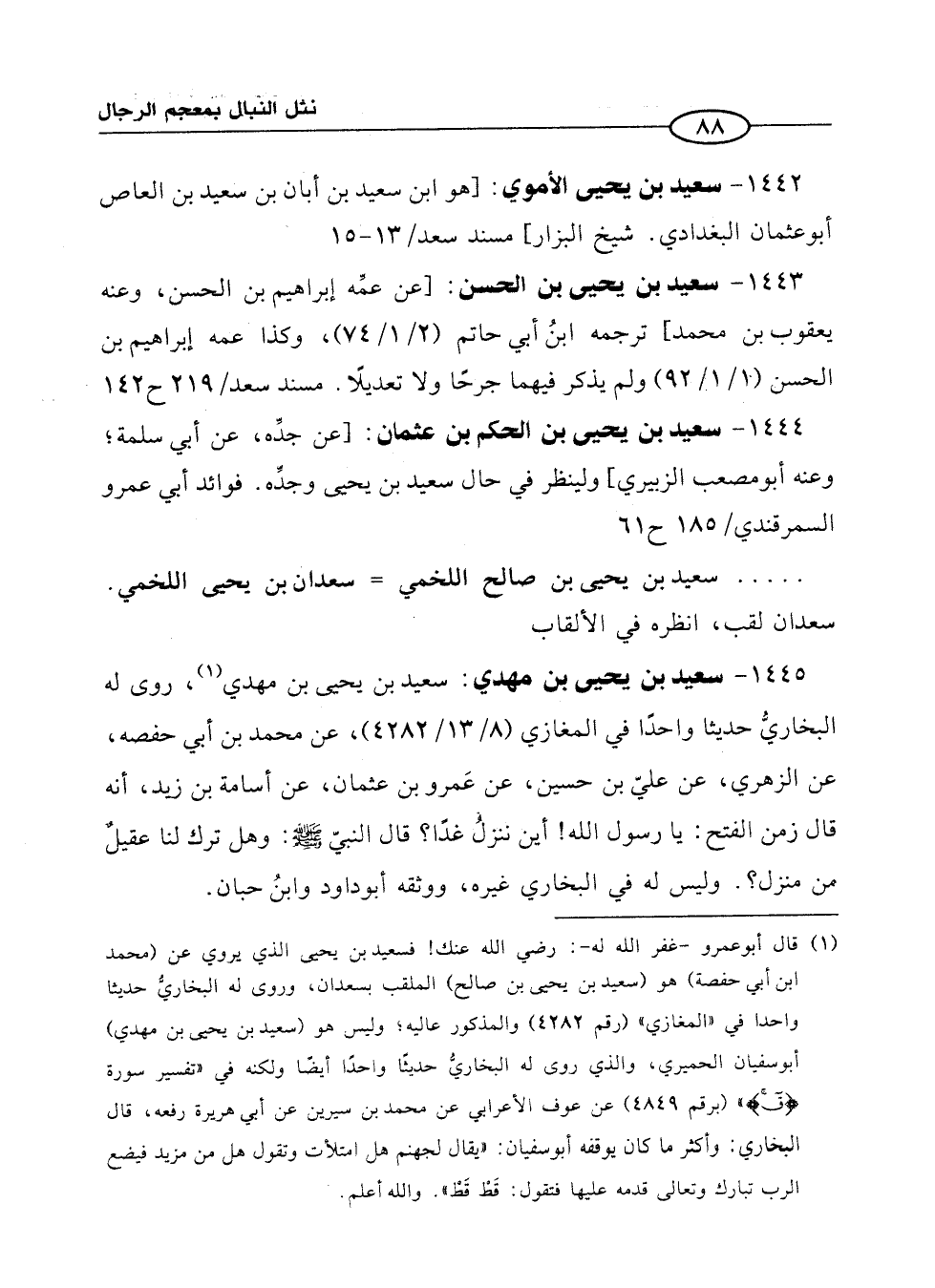 1445 - سعيد بن يحيى بن مهدي: سعيد بن يحيى بن مهدي (1)، روى له البخاريُّ حديثًا واحدًا في المغازي (8/ 13/ 4282)، عن محمد بن أبي حفصة، عن الزهري، عن عليّ بن حسين، عن عَمرو بن عثمان، عن أسامة بن زيد، أنه قال زمن الفتح: يا رسول الله! أين ننزلُ غدًا؟ قال النبيّ - صلى الله عليه وسلم -: وهل ترك لنا عقيلٌ من منزل؟. وليس له في البخاري غيره، ووثقه أبو داود وابنُ حبان.