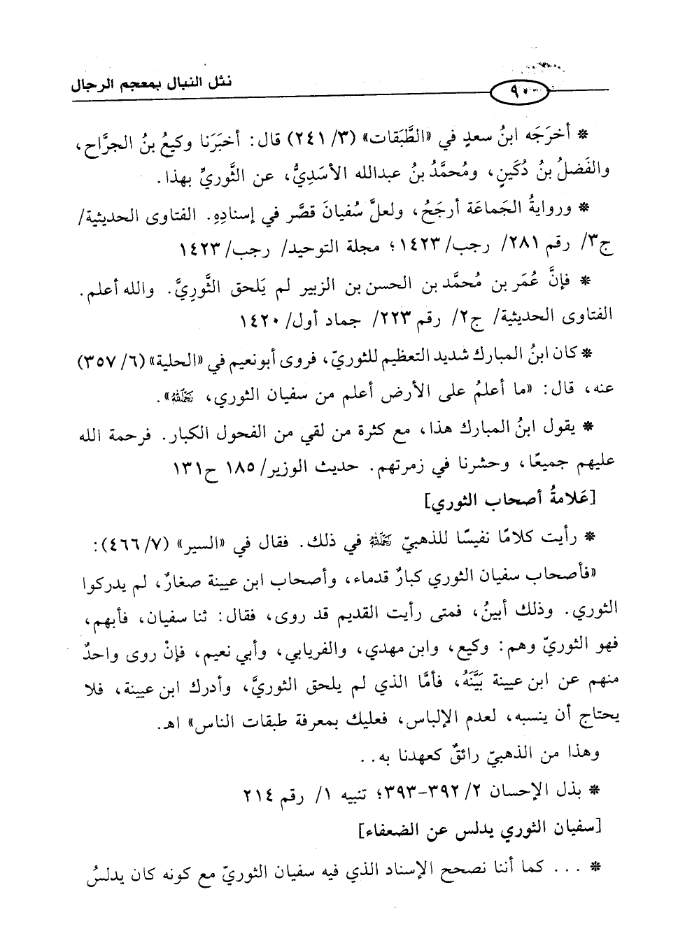 * رأيت كلامًا نفيسًا للذهبيّ رحمه الله في ذلك. فقال في "السير" (7/ 466): "فأصحاب سفيان الثوري كبارٌ قدماء، وأصحاب ابن عيينة صغارٌ، لم يدركوا الثوري. وذلك أبينُ، فمتى رأيت القديم قد روى، فقال: ثنا سفيان، فأبهم، فهو الثوريّ وهم: وكيع، وابن مهدي، والفريابي، وأبي نعيم، فإنْ روى واحدٌ منهم عن ابن عيينة بَيَّنَهُ، فأمَّا الذي لم يلحق الثوريَّ، وأدرك ابن عيينة، فلا يحتاج أن ينسبه، لعدم الإلباس، فعليك بمعرفة طبقات الناس" اهـ. وهذا من الذهبيّ رائقٌ كعهدنا به. .
