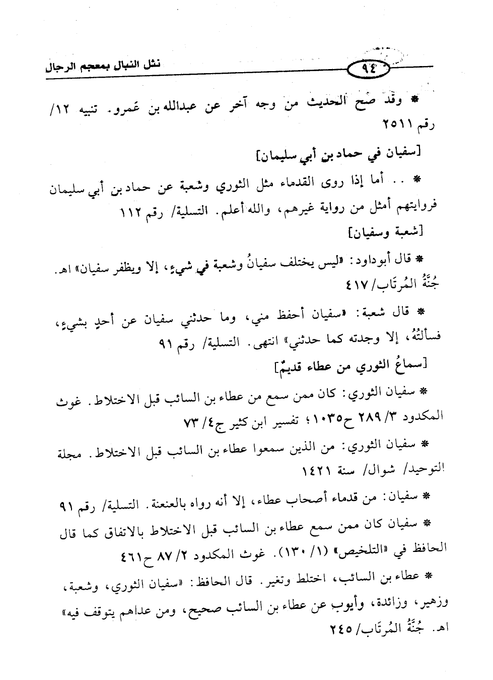 *. . أما إذا روى القدماء مثل الثوري وشعبة عن حماد بن أبي سليمان فروايتهم أمثل من رواية غيرهم، والله أعلم. التسلية/ رقم 112 [شعبة وسفيان]