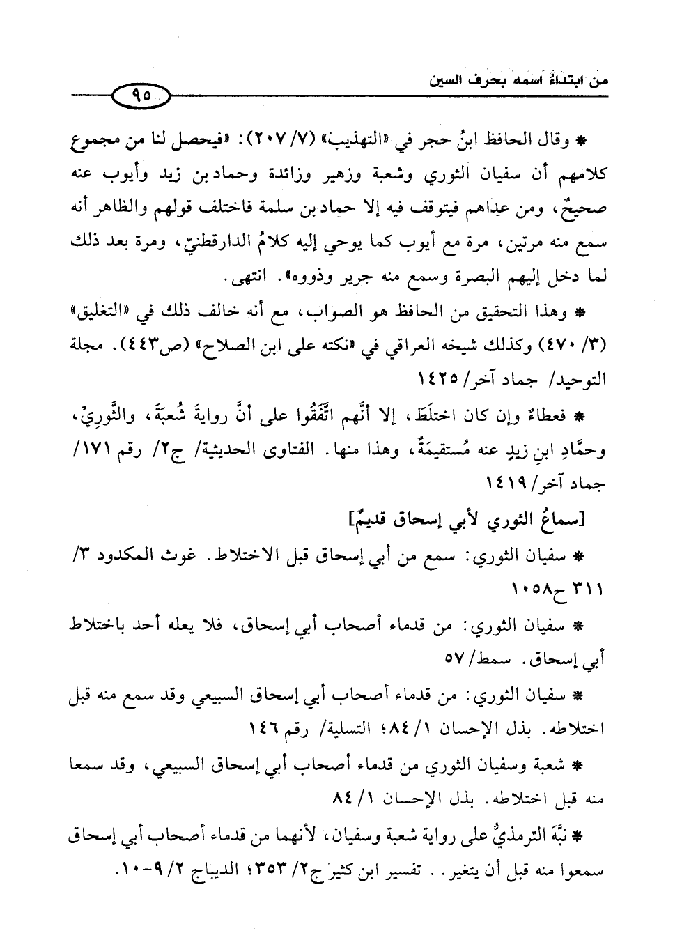 * سفيان الثوري: من قدماء أصحاب أبي إسحاق، فلا يعله أحد باختلاط أبي إسحاق. سمط/ 57