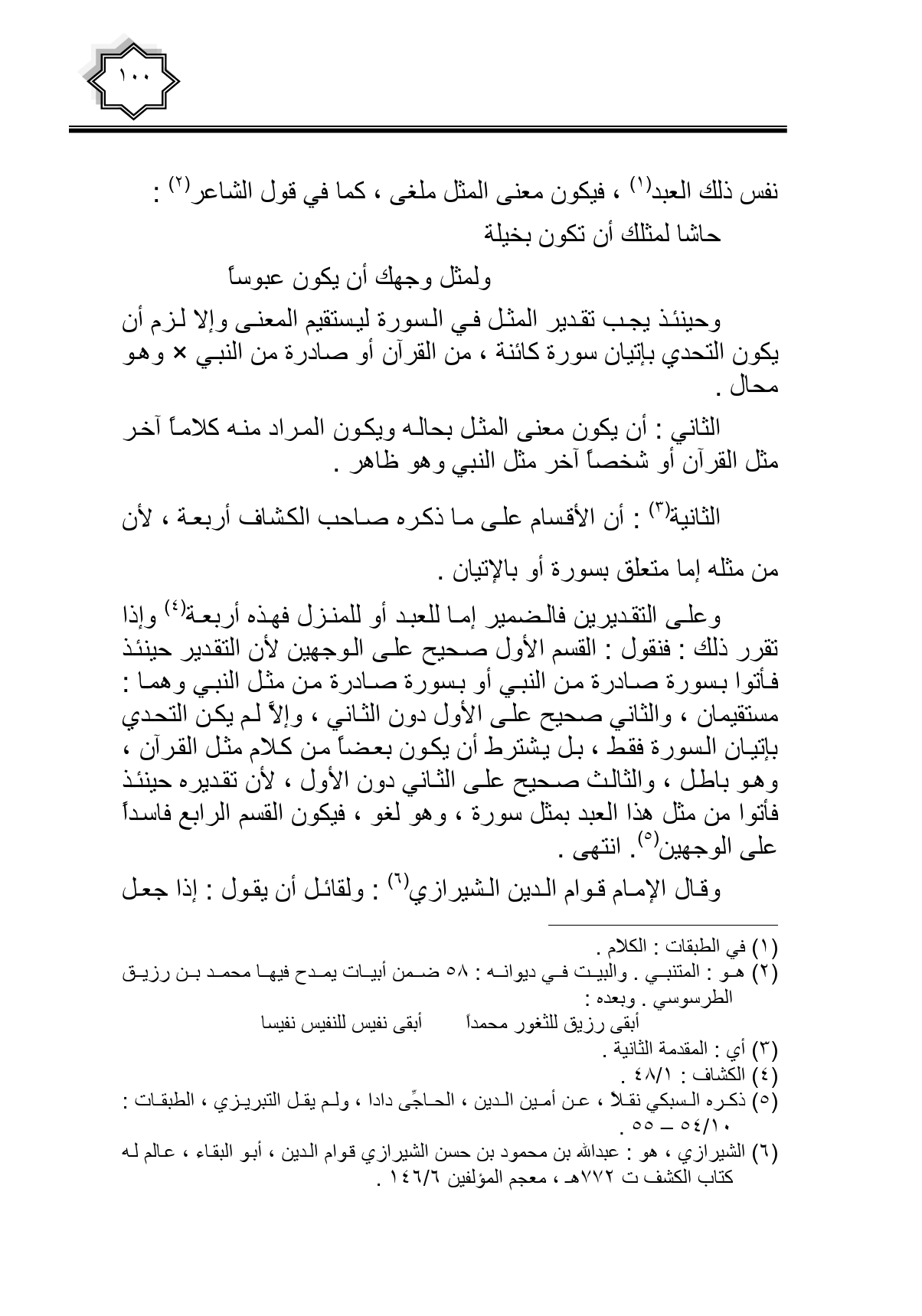 وعلى التقديرين فالضمير إما للعبد أو للمنزل فهذه أربعة وإذا تقرر ذلك: فنقول: القسم الأول صحيح على الوجهين لأن التقدير حينئذ فأتوا بسورة صادرة من النبي أو بسورة صادرة من مثل النبي وهما: مستقيمان، والثاني صحيح على الأول دون الثاني، وإلا لم يكن التحدي بإتيان السورة فقط، بل يشترط أن يكون بعضاً من كلام مثل القرآن، وهو باطل، والثالث صحيح على الثاني دون الأول، لأن تقديره حينئذ فأتوا من مثل هذا العبد بمثل سورة، وهو لغو، فيكون القسم الرابع فاسداً على الوجهين انتهى.