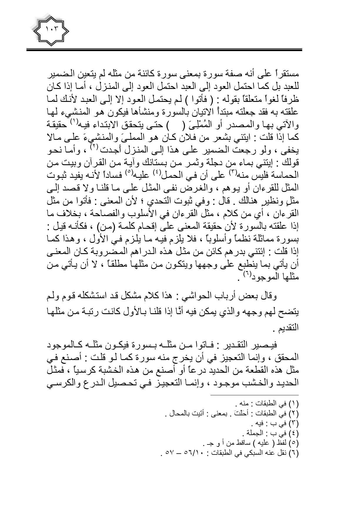 مستقراً على أنه صفة سورة بمعنى سورة كائنة من مثله لم يتعين الضمير للعبد بل كما احتمل العود إلى العبد احتمل العود إلى المنزل، أما إذا كان ظرفاً لغواً متعلقاً بقوله: (فأتوا) لم يحتمل العود إلا إلى العبد لأنك لما علقته به فقد جعلته مبتدأ الاتيان بالسورة ومنشأها فيكون هو المنشيء لها والآتي بها والمصدر أو المملي () حتى يتحقق الابتداء فيه حقيقة كما إذا قلت: ايتني بشعر من فلان كان هو المملى والمنشيء على ما لا يخفى، ولو رجعت الضمير على هذا إلى المنزل أجدت، وأما نحو قولك: إيتني بماء من دجلة وثمر من بستانك وآية من القرآن وبيت من الحماسة فليس منه على أن في الحمل عليه فساداً لأنه يفيد ثبوت المثل للقرآن أو يوهم، والغرض نفى المثل على ما قلنا ولا قصد إلى مثل ونظير هنالك. قال: وفي ثبوت التحدي؛ لأن المعنى: فأتوا من مثل القرآن، أي من كلام، مثل القرآن في الأسلوب والفصاحة، بخلاف ما إذا علقته بالسورة لأن حقيقة المعنى على إقحام كلمة (من)، فكأنه قيل: بسورة مماثلة نظماً وأسلوباً، فلا يلزم فيه ما يلزم في الأول، وهذا كما إذا قلت: إئتني بدرهم كائن من مثل هذه الدراهم المضروبة كان المعنى أن يأتي بما ينطبع على وجهها ويتكون من مثلها مطلقاً، لا أن يأتي من مثلها الموجود.