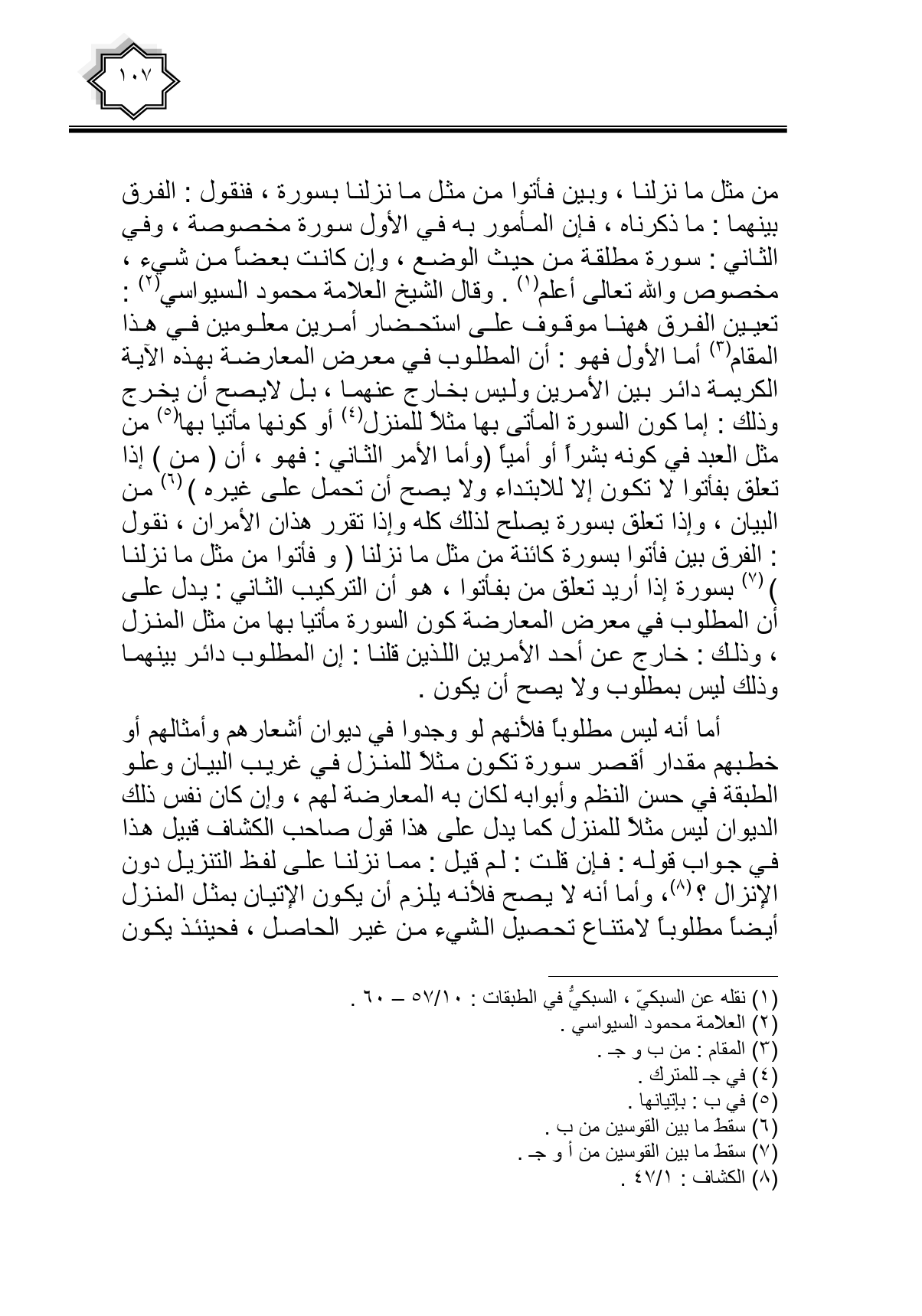 من مثل ما نزلنا، وبين فأتوا من مثل ما نزلنا بسورة، فنقول: الفرق بينهما: ما ذكرناه، فإن المأمور به في الأول سورة مخصوصة، وفي الثاني: سورة مطلقة من حيث الوضع، وإن كانت بعضاً من شيء، مخصوص والله تعالى أعلم. وقال الشيخ العلامة محمود السيواسي: تعيين الفرق ههنا موقوف على استحضار أمرين معلومين في هذا المقام أما الأول فهو: أن المطلوب في معرض المعارضة بهذه الآية الكريمة دائر بين الأمرين وليس بخارج عنهما، بل لا يصح أن يخرج وذلك: إما كون السورة المأتي بها مثلا للمنزل أو كونها مأتيا بها من مثل العبد في كونه بشراً أو أمياً (وأما الأمر الثاني: فهو، أن {مِنْ} إذا تعلق بفأتوا لا تكون إلا للابتداء ولا يصح أن تحمل على غيره) من البيان، وإذا تعلق بسورة يصلح لذلك كله وإذا تقرر هذان الأمران، نقول: الفرق بين فأتوا بسورة كائنة من مثل ما نزلنا (وفأتوا من مثل ما نزلنا) بسورة إذا أريد تعلق من بفأتوا، هو أن التركيب الثاني: يدل على أن المطلوب في معرض المعارضة كون السورة مأتيا بها من مثل المنزل، وذلك: خارج عن أحد الأمرين اللذين قلنا: إن المطلوب دائر بينهما وذلك ليس بمطلوب ولا يصح أن يكون.