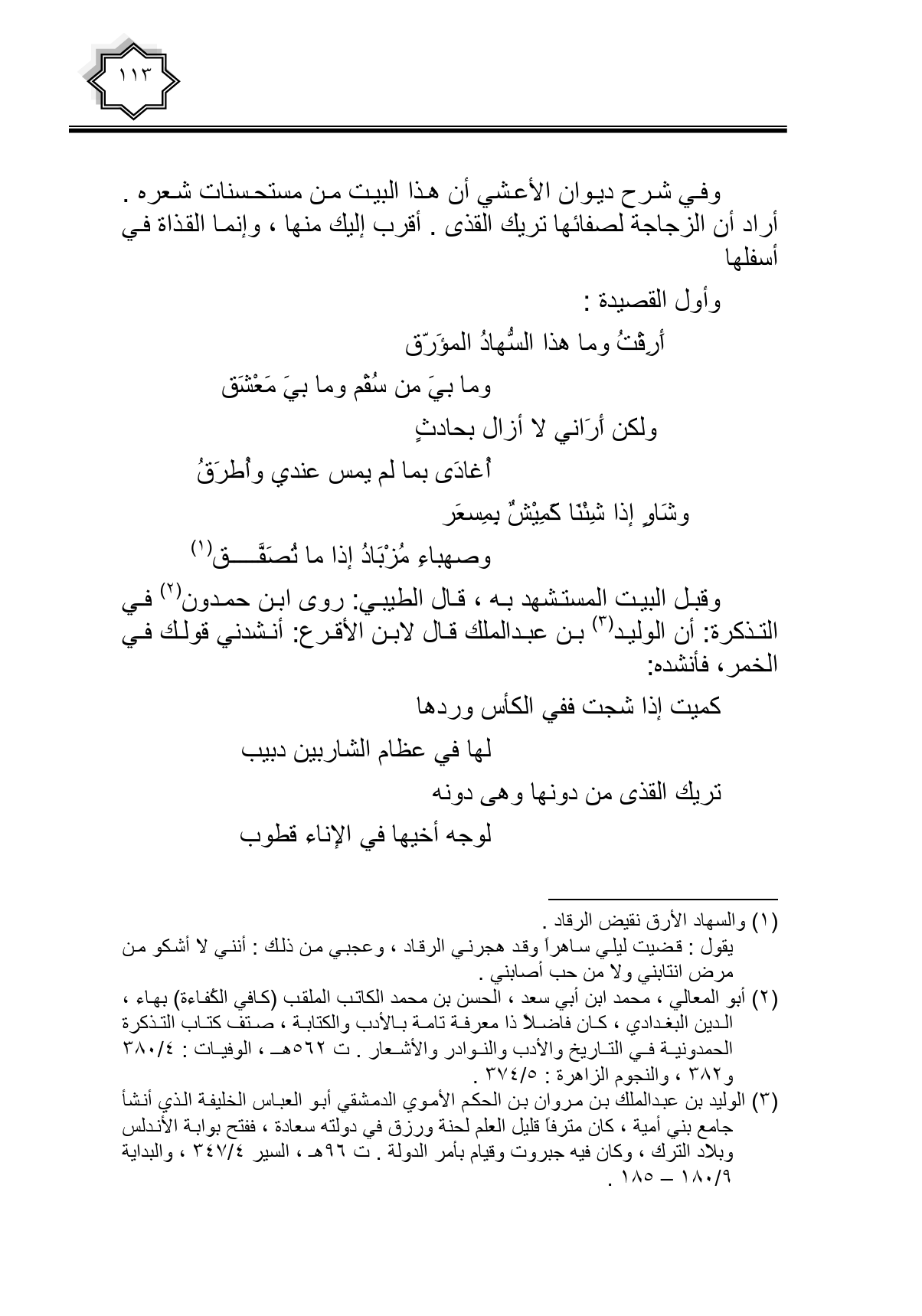 وقبل البيت المستشهد به، قال الطيبي: روى ابن حمدون في التذكرة: أن الوليد بن عبد الملك قال لابن الأقرع: أنشدني قولك في الخمر، فأنشده: