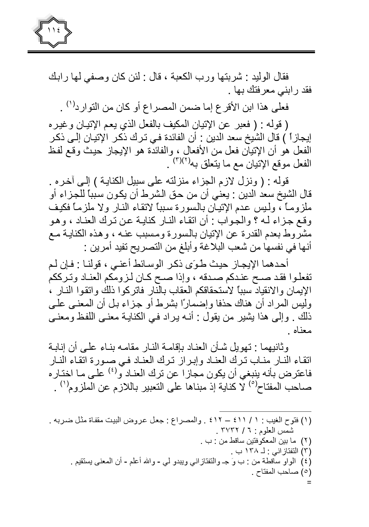 قوله: (ونزل لازم الجزاء منزلته على سبيل الكناية) إلى آخره. قال الشيخ سعد الدين: يعني أن من حق الشرط أن يكون سبباً للجزاء أو ملزوماً، وليس عدم الإتيان بالسورة سبباً لاتقاء النار ولا ملزماً فكيف وقع جزاء له؟ والجواب: أن اتقاء النار كناية عن ترك العناد، وهو مشروط بعدم القدرة عن الاتيان بالسورة ومسبب عنه، وهذه الكناية مع أنها في نفسها من شعب البلاغة وأبلغ من التصريح تفيد أمرين: