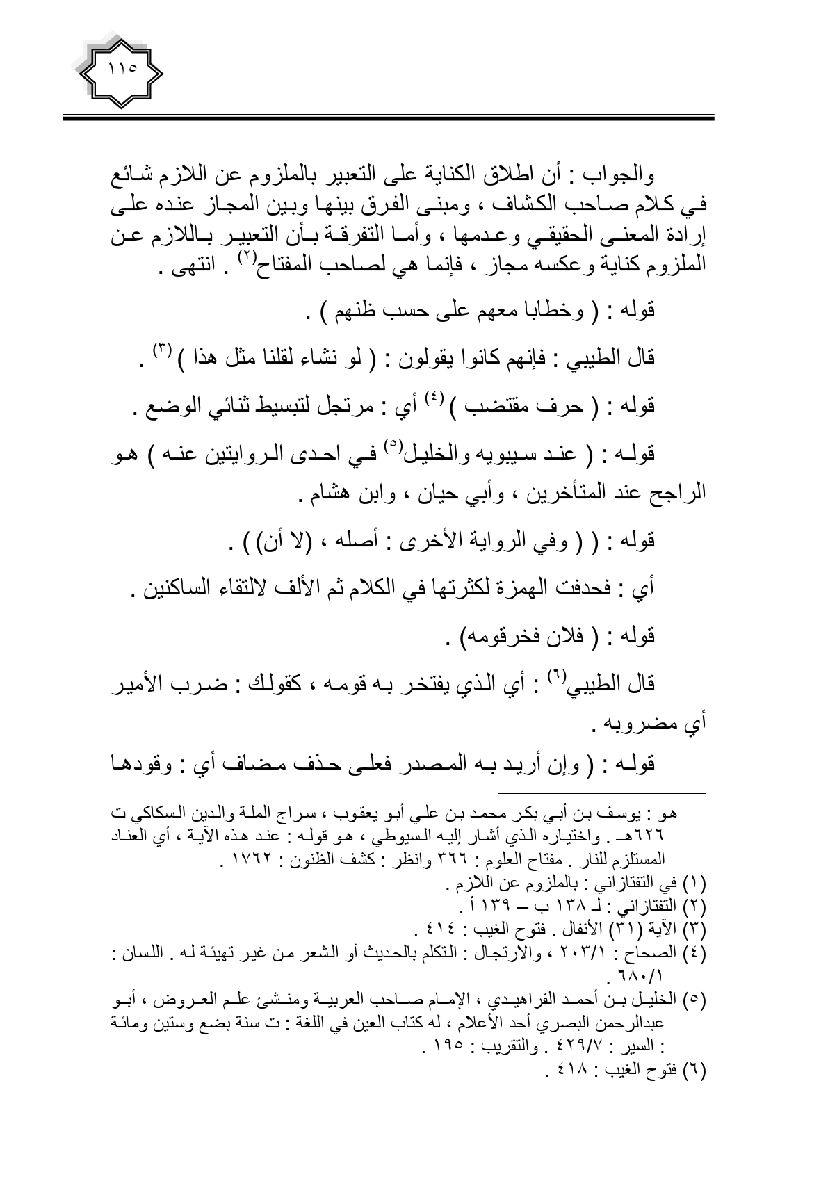 والجواب: أن اطلاق الكناية على التعبير بالملزوم عن اللازم شائع في كلام صاحب الكشاف، ومبنى الفرق بينها وبين المجاز عنده على إرادة المعنى الحقيقي وعدمها، وأما التفرقة بأن التعبير باللازم عن الملزوم كناية وعكسه مجاز، فإنما هي لصاحب المفتاح. انتهى.