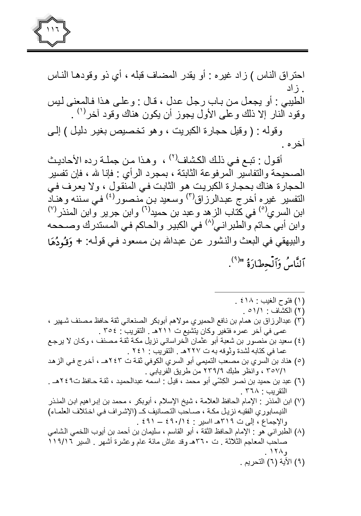 أقول: تبع في ذلك الكشاف، وهذا من جملة رده الأحاديث الصحيحة والتفاسير المرفوعة الثابتة، بمجرد الراي: فإنا لله، فإن تفسير الحجارة هناك بحجارة الكبريت هو الثابت في المنقول، ولا يعرف في التفسير غيره أخرج عبد الرزاق وسعيد بن منصور في سننه وهناك ابن السري في كتاب الزهد وعبد بن حميد وابن جرير وابن المنزر وابن أبي حاتم والطبراني في الكبير والحاكم في المستدرك وصححه والبيهقي في البعث والنشور عن عبد الله بن مسعود في قوله: {وَقُودُهَا النَّاسُ وَالْحِجَارَةُ}.