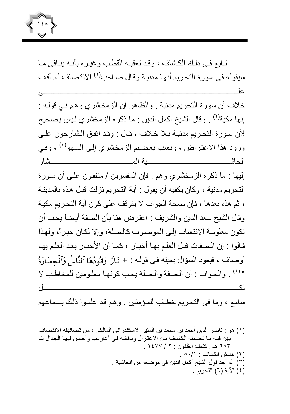 تابع في ذلك الكشاف، وقد تعقبه القطب وغيره بأنه ينافي ما سيقوله في سورة التحريم أنها مدنية وقال صاحب الانتصاف لم أقف على خلاف أن سورة التحريم مدنية. والظاهر أن الزمخشري وهم في قوله: إنها مكية. وقال الشيخ أكمل الدين: ما ذكره الزمخشري ليس بصحيح لأن سورة التحريم مدنية بلا خلاف، قال: وقد اتفق الشارحون على ورود هذا الاعتراض، ونسب بعضهم الزمخشري إلى السهو، وفي الحاشية المشار إليها: ما ذكره الزمخشري وهم. فإن المفسرين/ متفقون على أن سورة التحريم مدنية، وكان يكفيه أن يقول: أية التحريم نزلت قبل هذه بالمدينة، ثم هذه بعدها، فإن صحة الجواب لا يتوقف على كون آية التحريم مكية وقال الشيخ سعد الدين والشريف: اعترض هنا بأن الصفة أيضاً يجب أن تكون معلومة الانتساب إلى الموصوف كالصلة، وإلا لكان خبرا، ولهذا قالوا: إن الصفات قبل العلم بها أخبار، كما أن الأخبار بعد العلم بها أوصاف، فيعود السؤال بعينه في قوله: {نَارًا وَقُودُهَا النَّاسُ وَالْحِجَارَةُ}. والجواب: أن الصفة والصلة يجب كونها معلومين للمخاطب لا لكل سامع، وما في التحريم خطاب للمؤمنين. وهم قد علموا ذلك بسماعهم