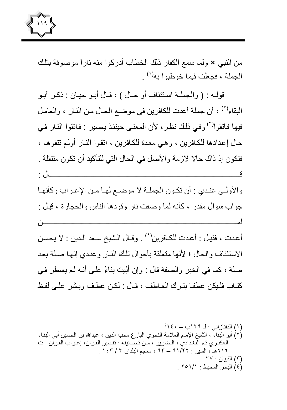 قوله: (والجملة استئناف أو حال)، قال أبو حيان: ذكر أبو البقاء، أن جملة أعدت للكافرين في موضع الحال من النار، والعامل فيها فاتقوا وفي ذلك نظر، لأن المعنى حينئذ يصير: فاتقوا النار في حال إعدادها للكافرين، وهي معدة للكافرين، اتقوا النار أو لم تتقوها، فتكون إذ ذاك حالا لازمة والأصل في الحال التي للتأكيد أن تكون منتقلة. قال: والأولى عندي: أن تكون الجملة لا موضع لها من الإعراب وكأ، ها جواب سؤال مقدر، كأنه لما وصفت نار وقودها الناس والحجارة، قيل: لمن أعدت، فقيل: أعدت للكافرين. وقال الشيخ سعد الدين: لا يحسن الاستئناف والحال؛ لأنها متعلقة بأحوال تلك النار وعندي إنها صلة بعد صلة، كما في الخبر والصفة قال: وإن أبيت بناء على أنه لم يسطر في كتاب فليكن عطفا بترك العاطف، قال: لكن عطف وبشر على لفظ