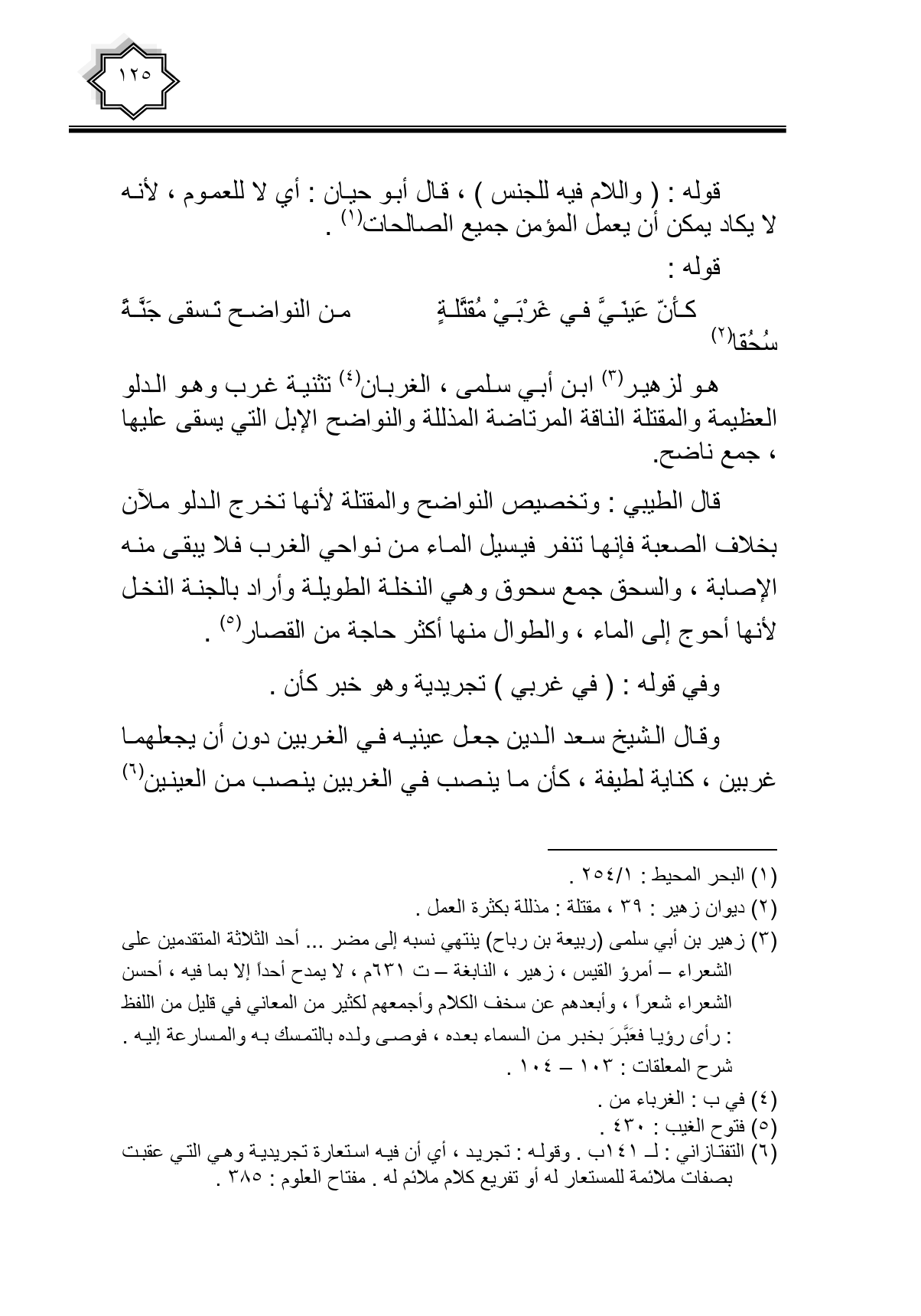 وقال الشيخ سعد الدين جعل عينيه في الغربين دون أن يجعلهما غربين، كناية لطيفة، كأن ما ينصب في الغربين ينصب من العينين