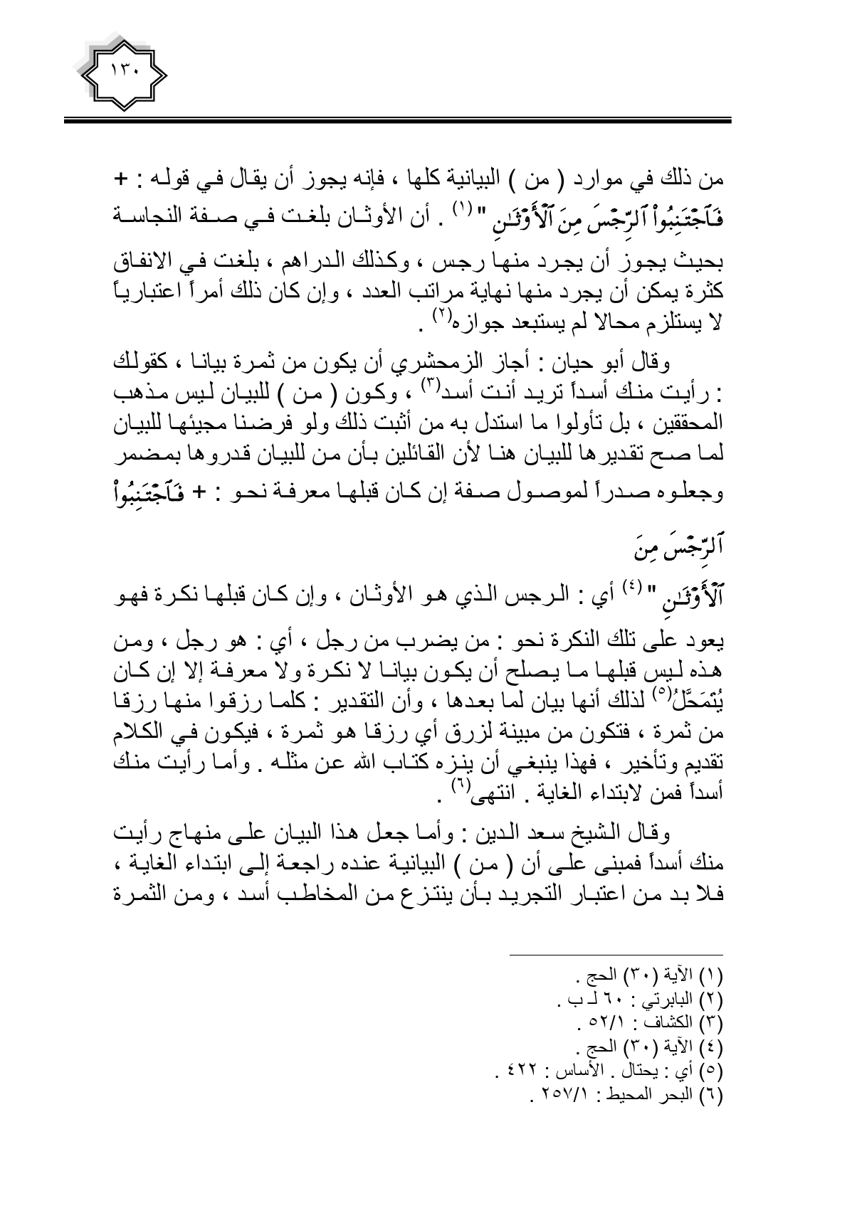 من ذلك في موارد (من) البيانية كلها، فإنه يجوز أن يقال في قوله: {فَاجْتَنِبُوا الرِّجْسَ مِنَ الْأَوْثَانِ} أن الأوثان بلغت في صفة النجاسة بحيث يجوز أن يجرد منها رجس، وكذلك الدراهم، بلغت في الأنفاق كثرة يمكن أن يجرد منها نهاية مراتب العدد، وإن كان ذلك أمراً اعتبارياً لا يستلزم محالا لم يستبعد جوازه.